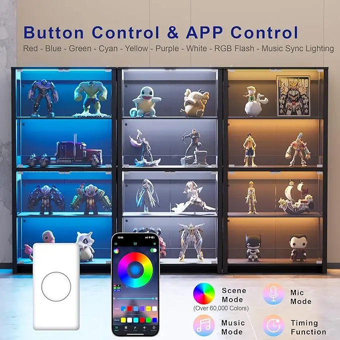 Customize ambiance with 60,000+ RGB colors and smooth transitions. Control via button or smartphone app. Ideal for living rooms or game rooms, the dynamic lighting transforms displays from subtle glows to vivid showcases.