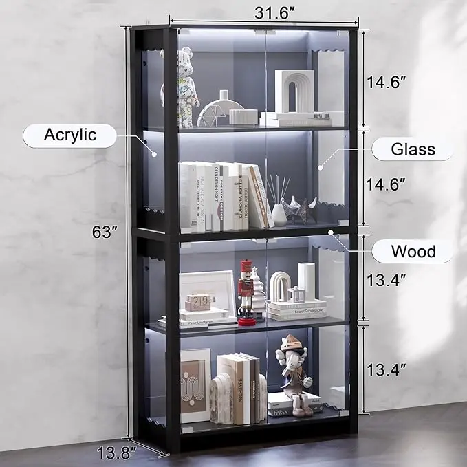 Effortlessly showcase collectibles on 4 tiers (2 adjustable). Built with premium MDF and heavy-duty metal hinges for lasting durability. Optional LED strips offer 60,000+ color options for custom displays. Perfect for art, figurines, or decor, blending function and style in any room.