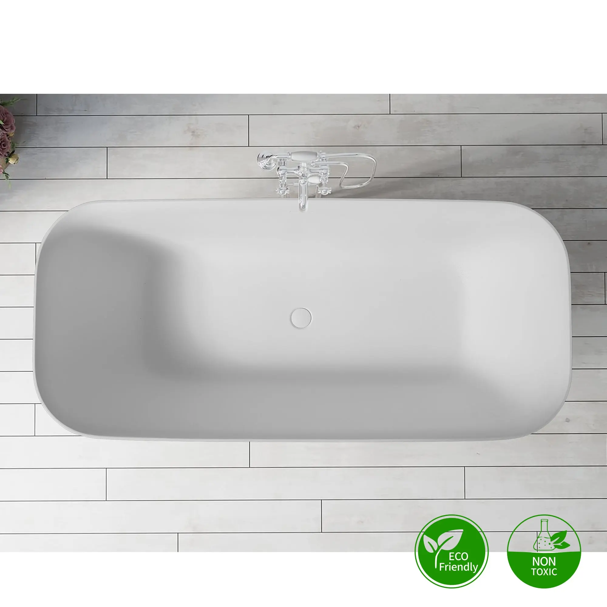 ·[Material] The solid surface bathtub is made of premium formula. The stone resin material has a smooth surface that is warm to the touch and resistant to household chemicals and cosmetic products