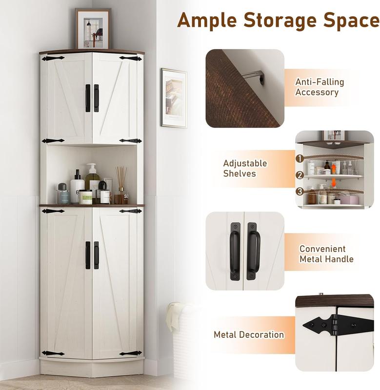 Easy to Assemble: The tall storage cabinet with doors package includes step-by-step instructions and all the hardware, and all parts and accessories are labeled. With an easy-to-follow instructions manual and only taking 30 minutes to assemble you can get a beautiful farmhouse bathroom corner storage cabinet/kitchen cabinet/living room tall corner cabinet!