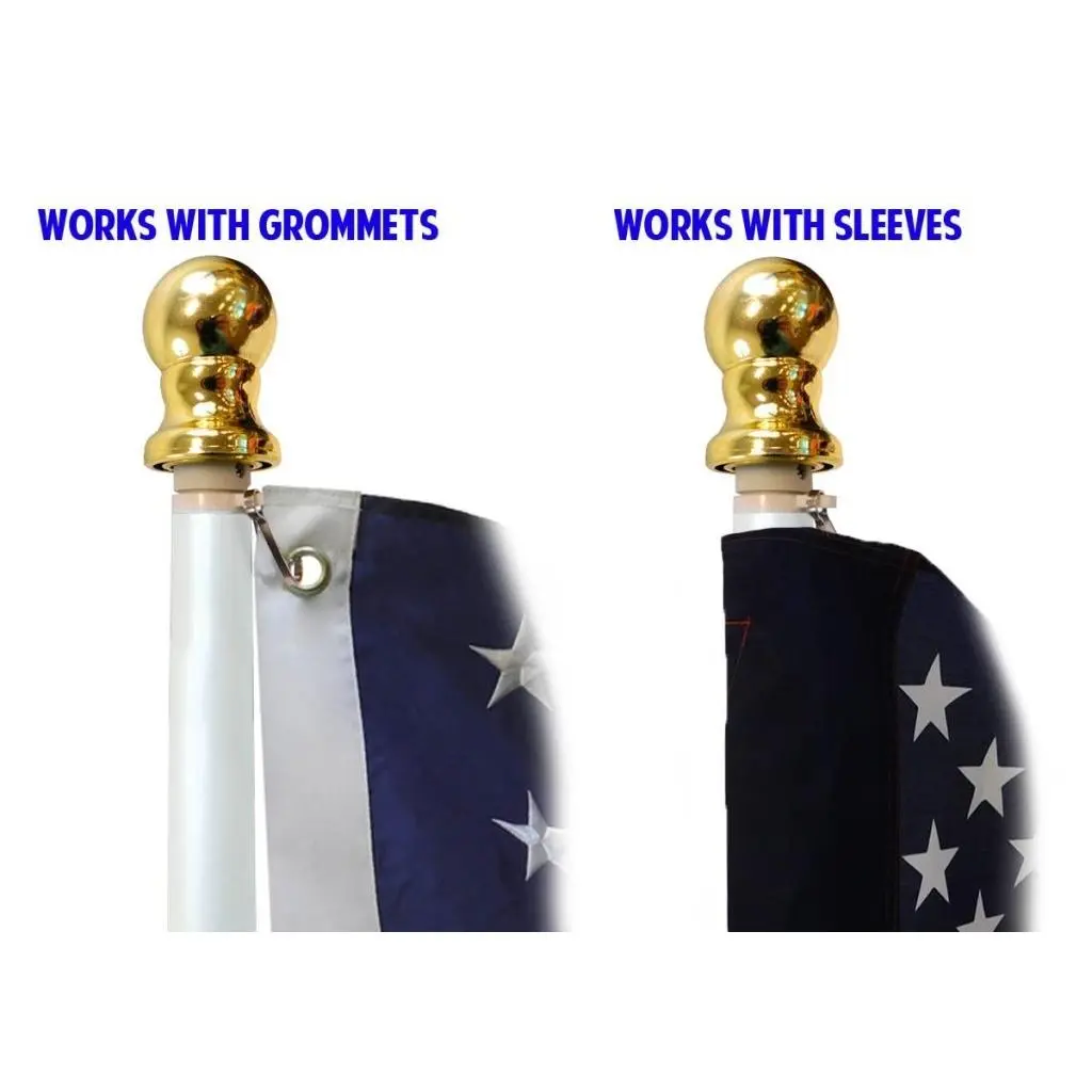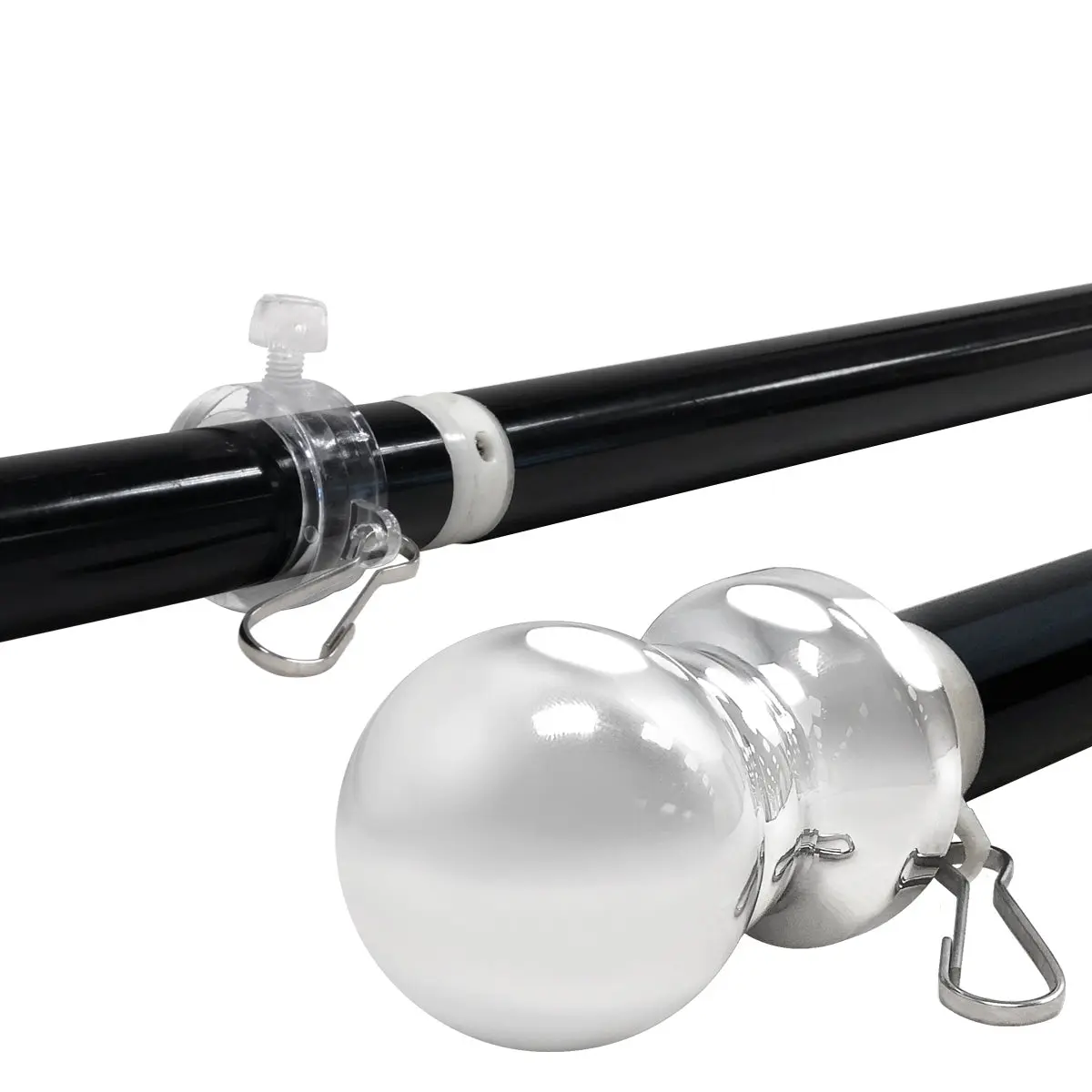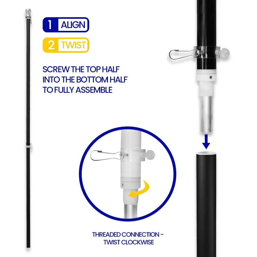2 Section Aluminum Spinning Stabilizer Pole is 6 feet long with a 1-inch diameter and Silver ball top and black finish. These poles were upgraded from our previous model for strength and durability. they now include a mid-section ball joint so that the pole spins freely, and the flag never tangles.