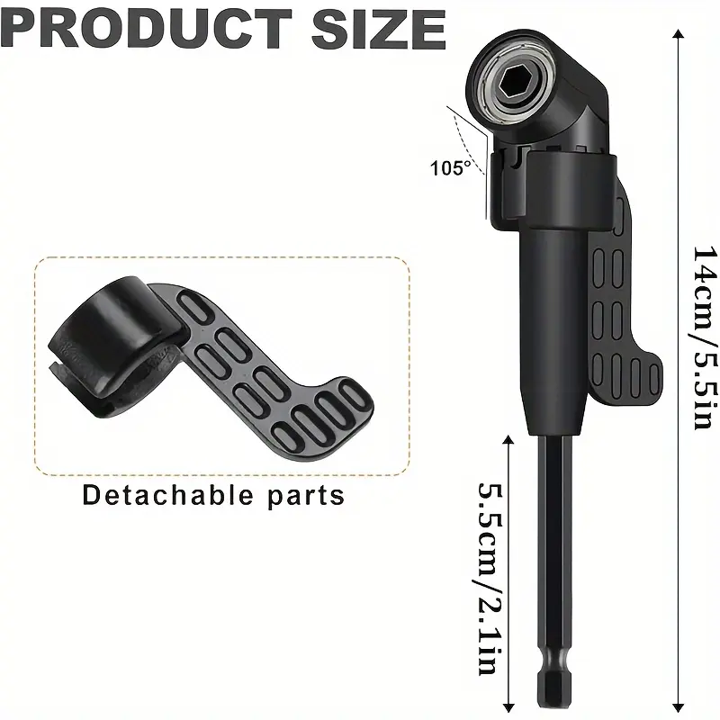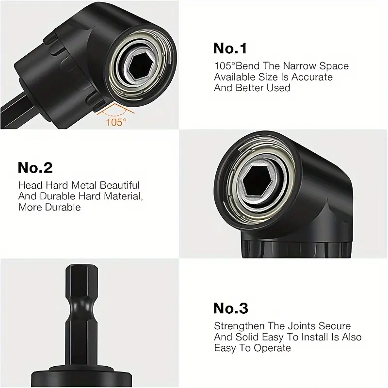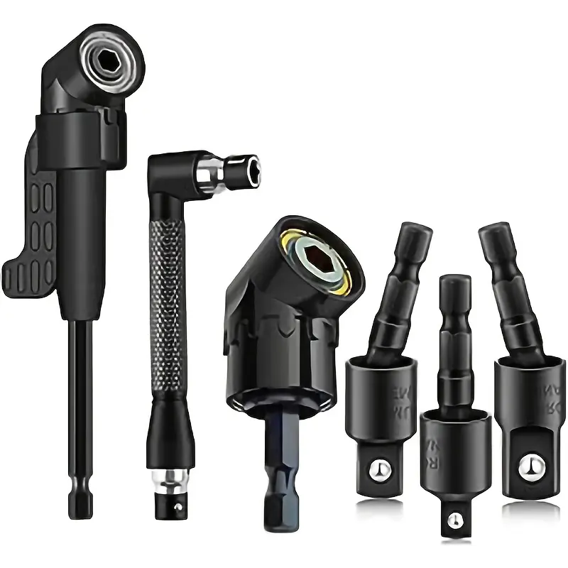 ·6-Piece Versatile Set: Includes 3 rotatable socket adapters (1/4", 3/8", 1/2"), 2 angle drill adapters (105° hex shank), and a 90° bevel drill bit, covering various drilling and driving needs.