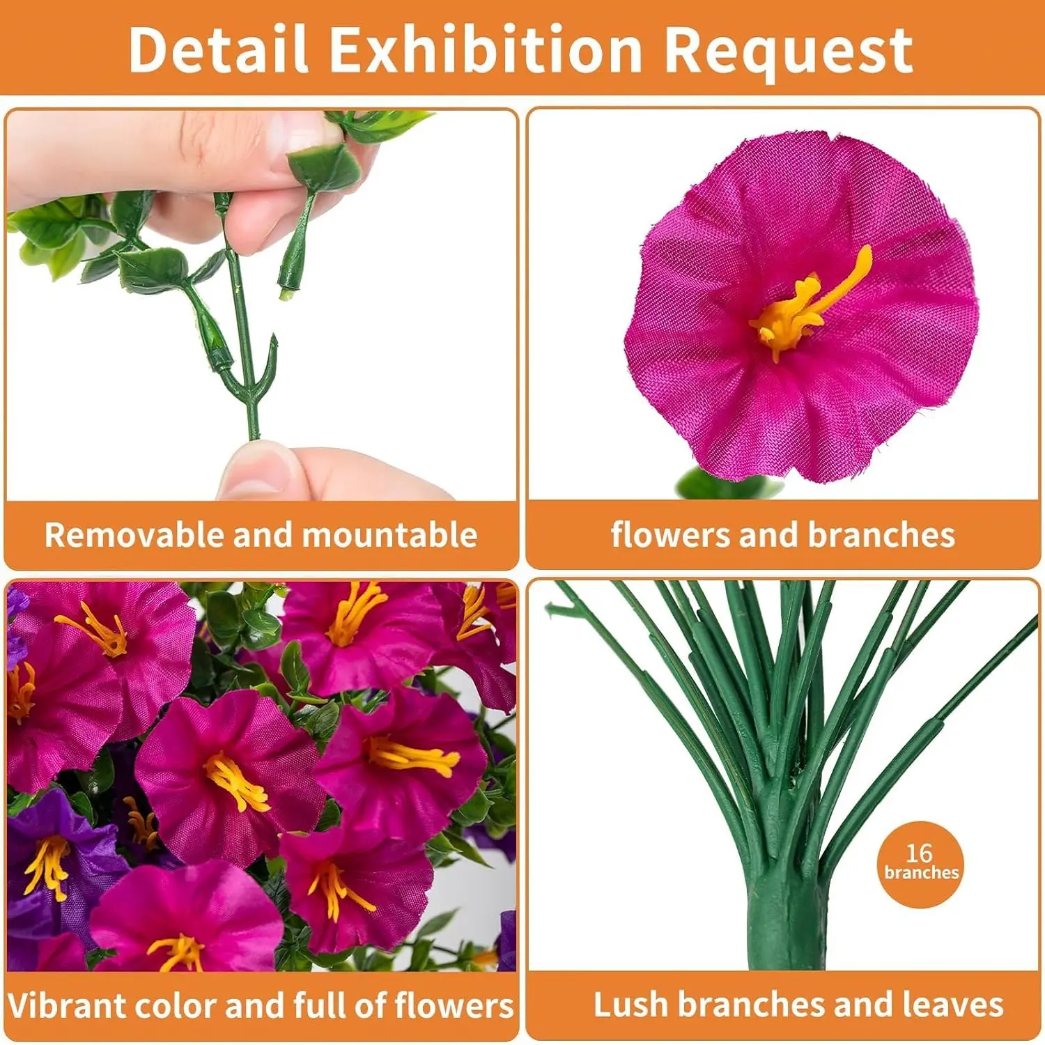 6 PCS Artificial Faux Hanging Flowers Plants for Outdoor Decor,Fake Silk Morning Glory with Eucalyptus UV Resistant Realistic Vines for Wall Home Porch Patio Balcony Yard Decor, Purple and Fuchsia, Artificial Flower Decoration