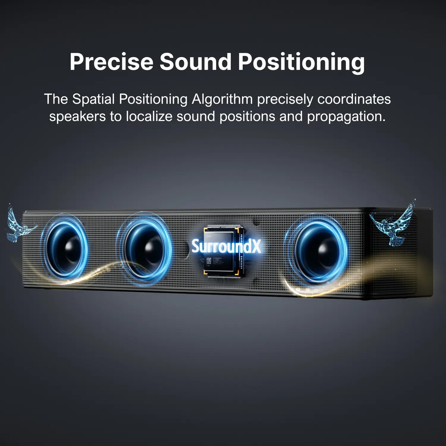 The Spatial Positioning Algorithm precisely coordinates speakers to localize sound positions and propagation.
