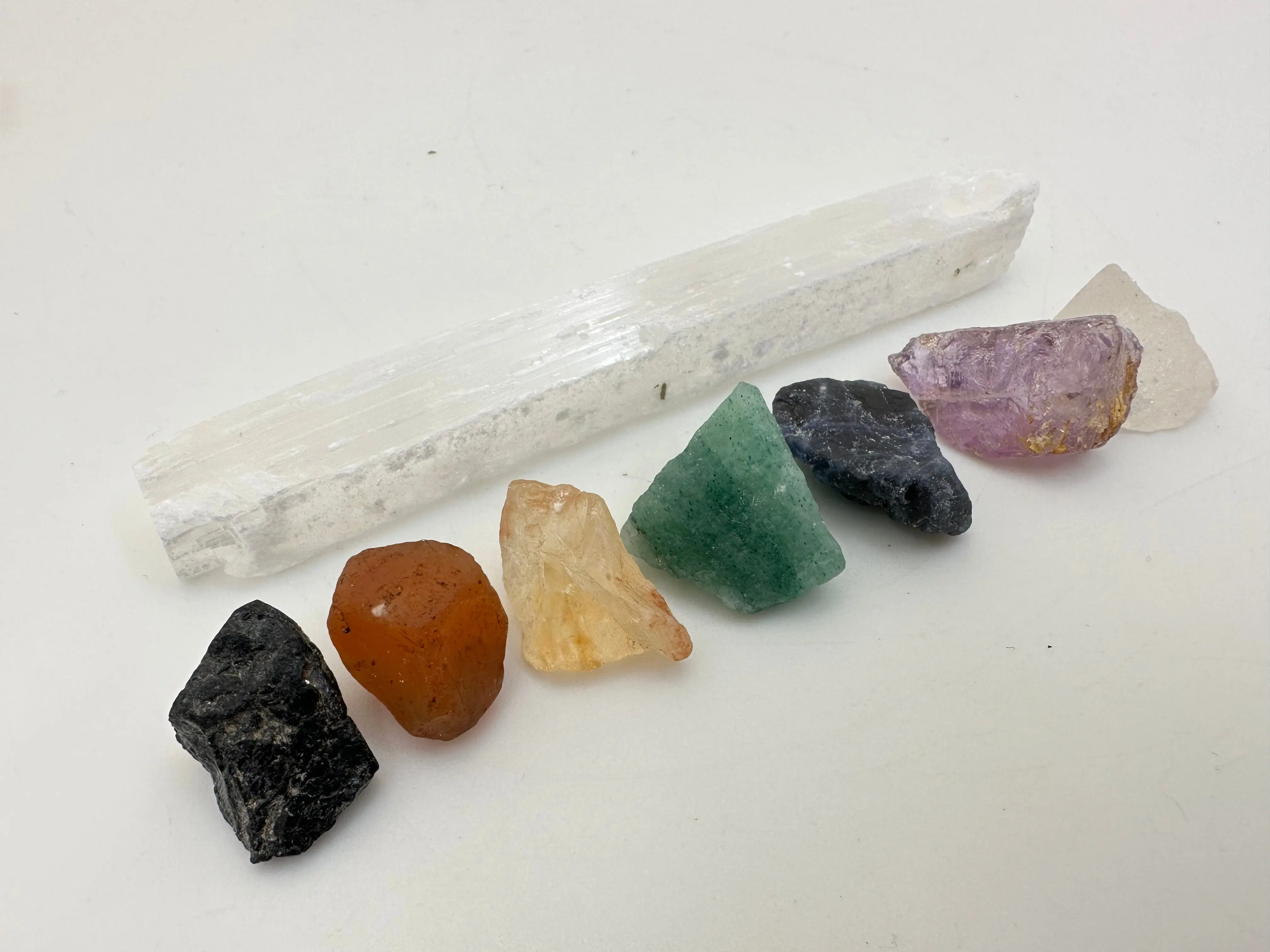 PRODUCT DETAILS: This listing is for a single 7 Chakra Crystal Set with Selenite Wand. Please note that these are stock photos of a few of the healing crystal sets that we have available. These sets have natural Crystals & Gemstones, so each stone and set will be unique and have variations in natural characteristics such as Size, Shape, Inclusions, and Color.