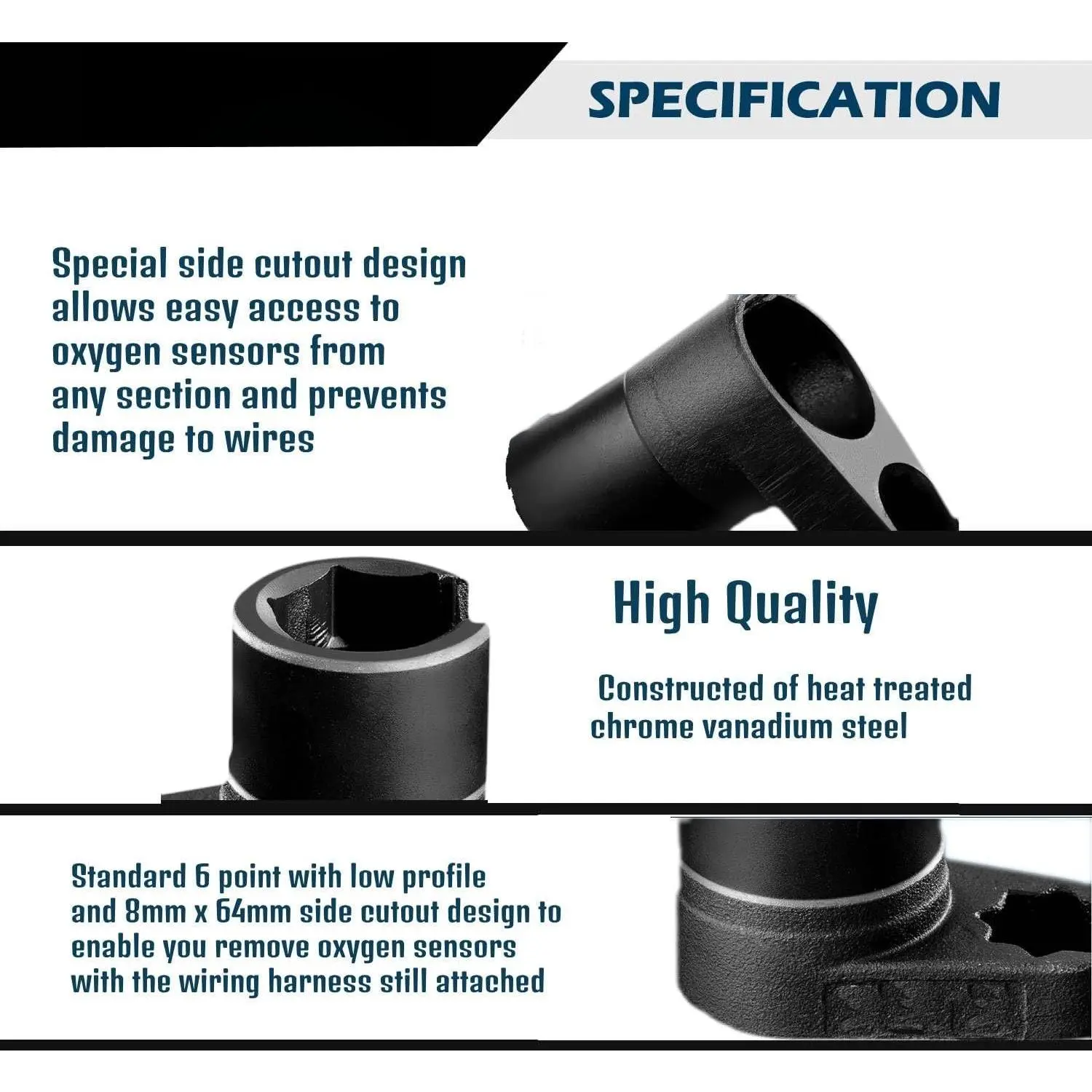 Design:Standard 6 point with low profile and 8mm x 64mm side cutout design to enable you remove sensors with the wiring harness still attached, and the socket is offset and compact which allows extra leverage even in hard to reach spots
