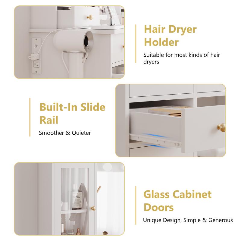 ·【Built-in Charging Station & Hair Dryer Rack】The modern vanity comes with a power strip, including 2 AC outlets and 2 USB ports, through which you can charge and use electronic devices at the same time. In addition, our vanity desk provides you with a hair dryer rack to keep your hair dryer and hair curler within arm’s reach