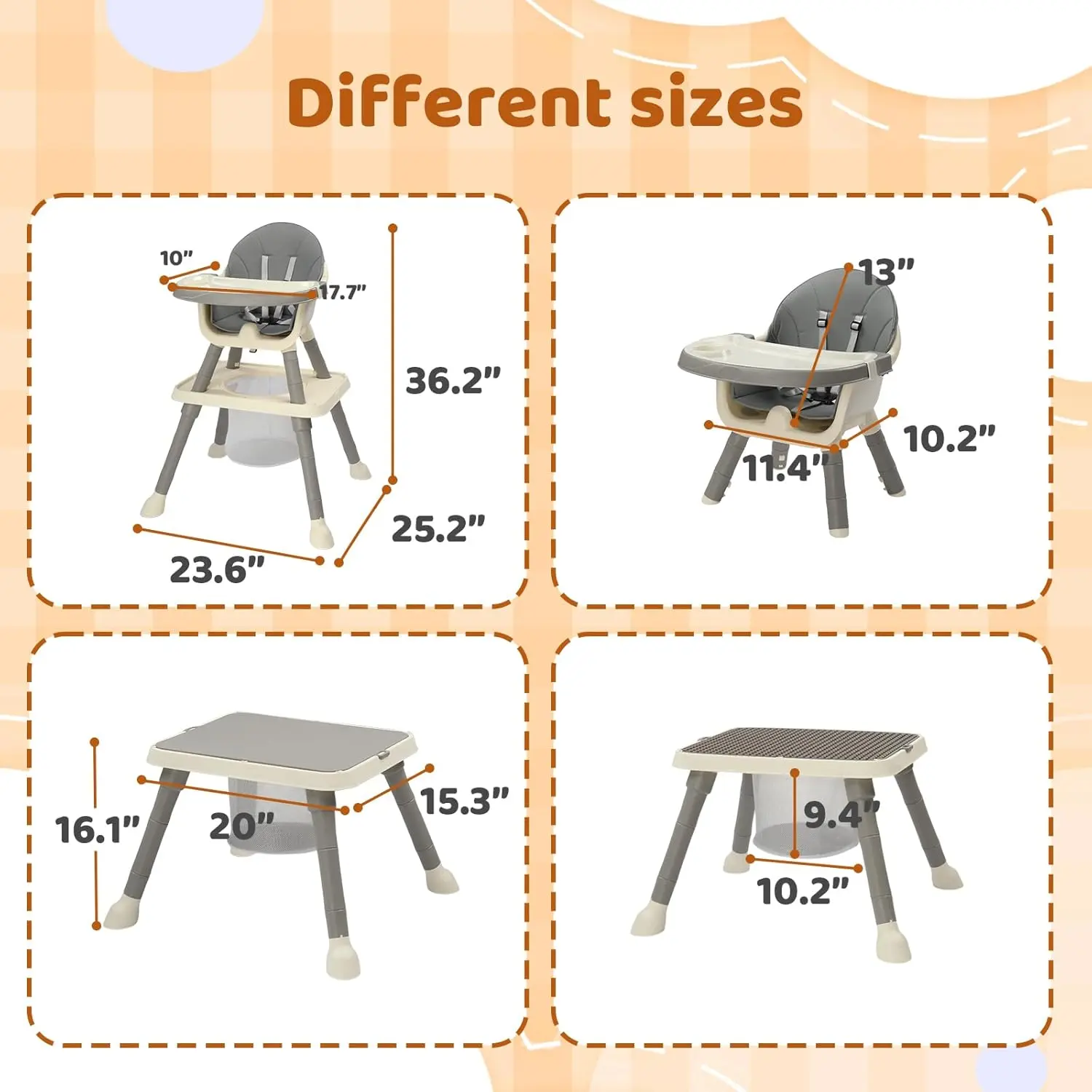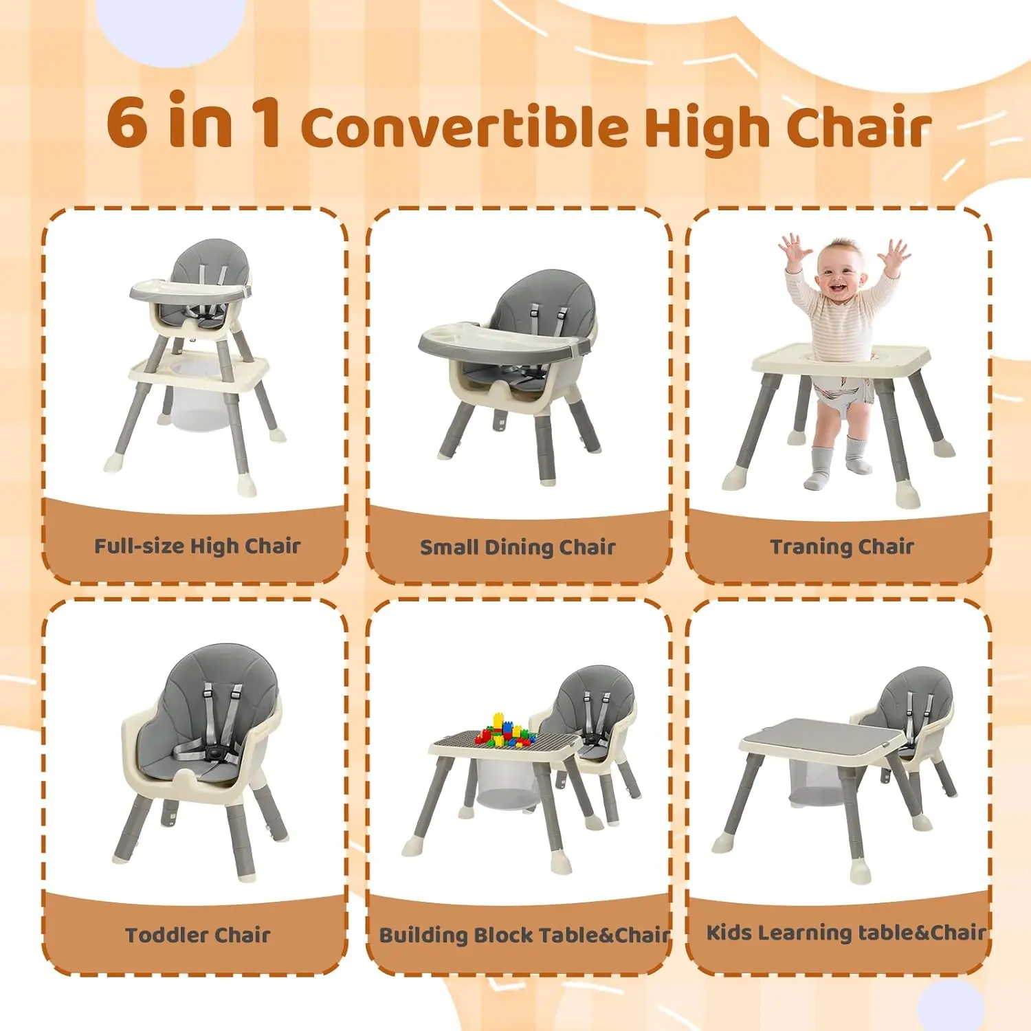 ·VERSATILE DESIGN: 7-in-1 convertible high chair transforms into baby highchair, floor chair, toddler chair, learning table & chair, and building block table setup
