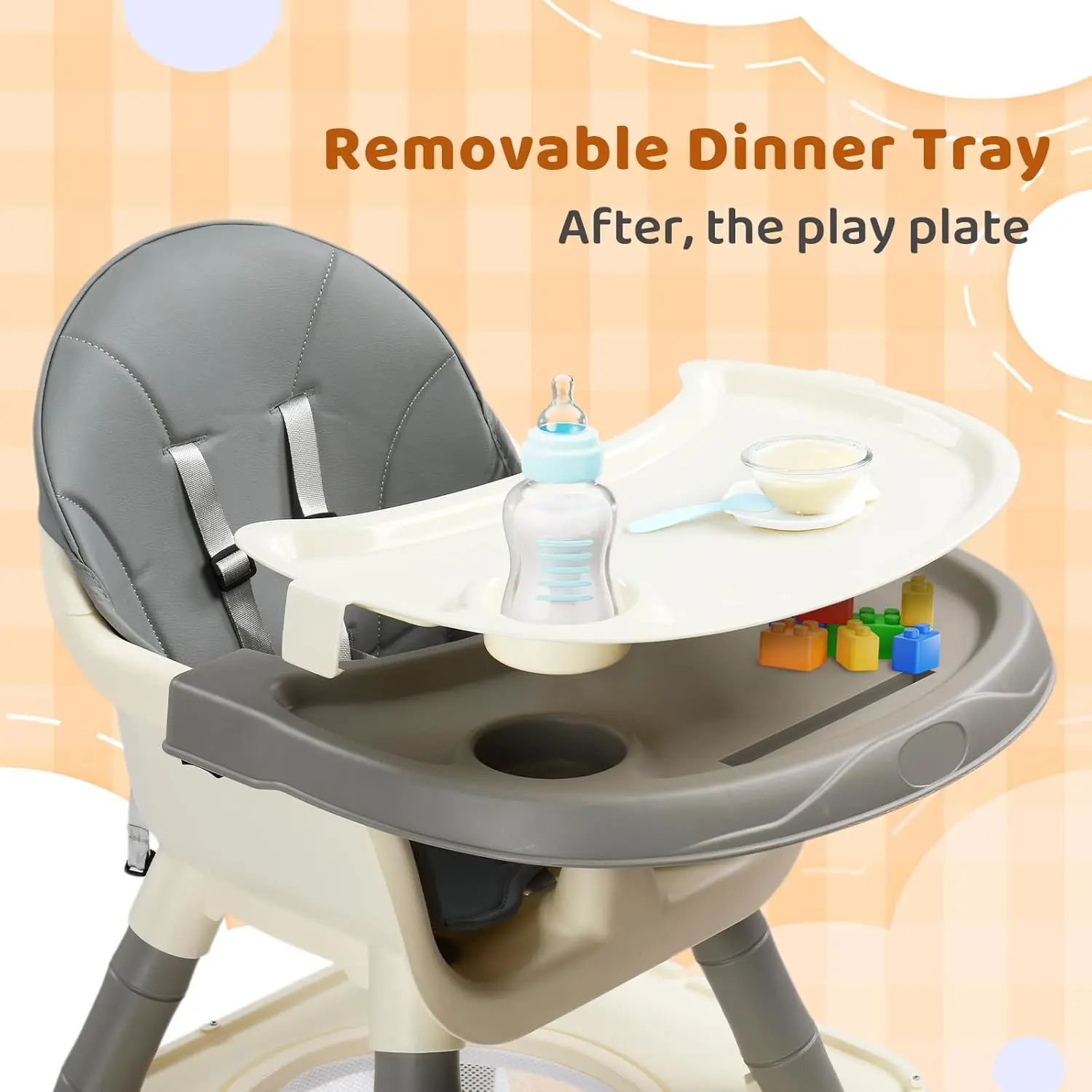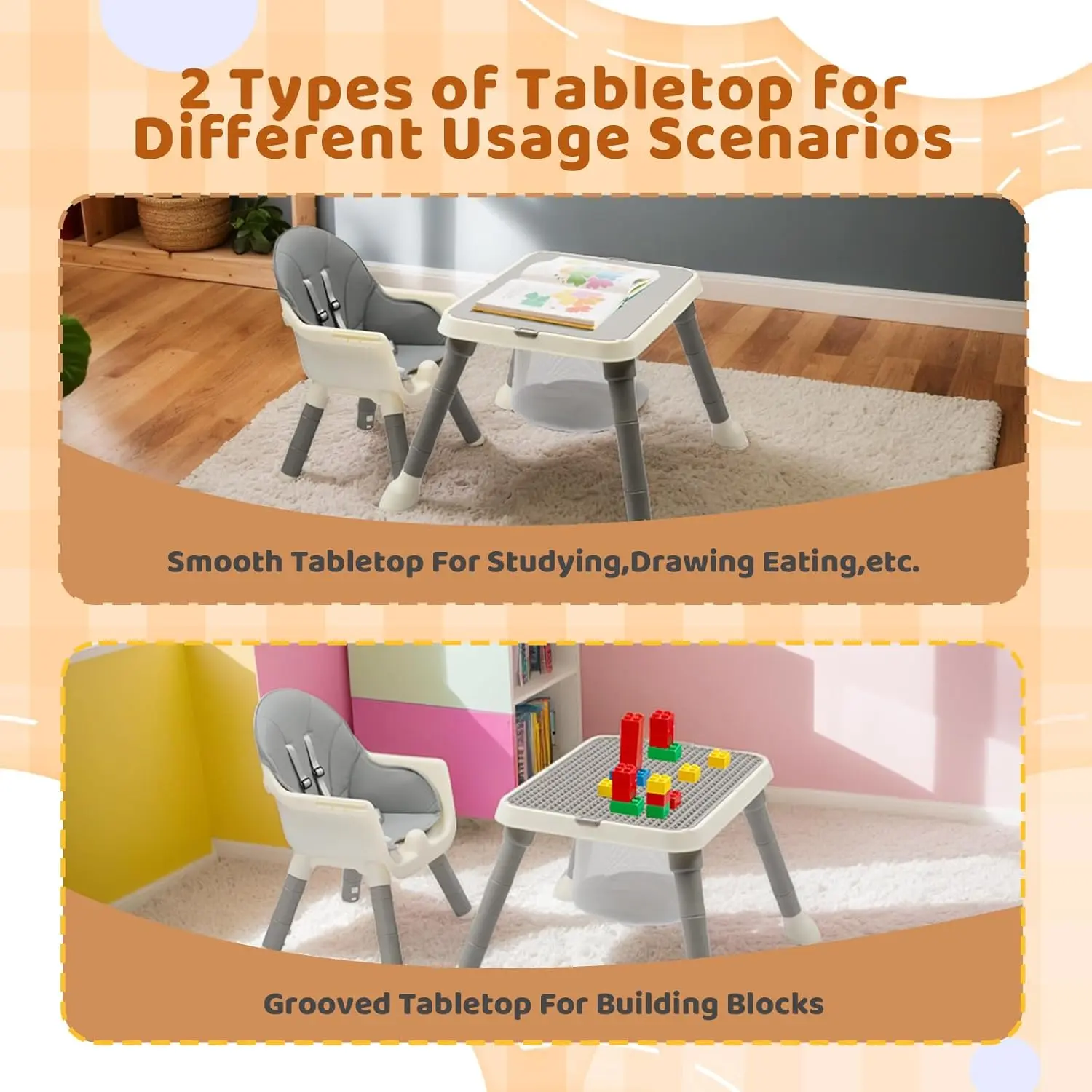 ·2-in-1 Play & Study Table | Parent’s Helper: Flip the tabletop: Smooth side for meals & homework → Textured side for 9mm+ blocks. Self-entertaining design keeps toddlers busy while you cook – unlike basic high chairs!