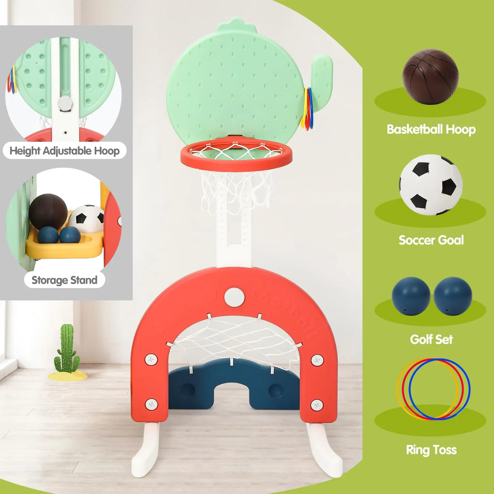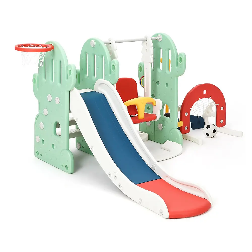 Includes slide, swing, climbing ladders, basketball hoop, soccer, golf, and ring toss for endless entertainment.