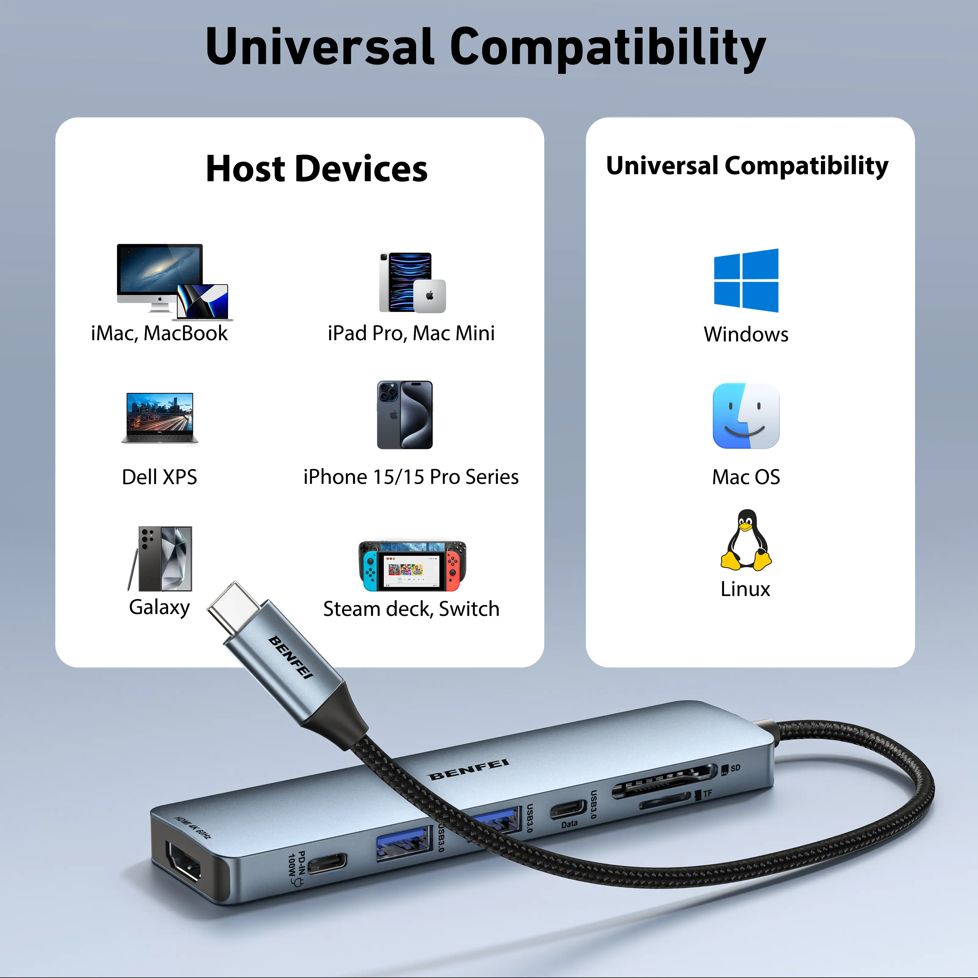 ·【Powerful USB-C HUB with 18 Month warranty】 BENFEI USB Type-C HUB, with super-soft and knot-free silicone woven design cable, meets most mobile office needs. Compact, lightweight, stylish, and powerful portable USB C Hub equipped with 1 x HDMI port, 1 x 100W charging, 2 x USB 3.0 ports, 1 USB-C data port, SD/TF Card reader. 18-month warranty, 24-hour response, to ensure you feel at ease when using our product.