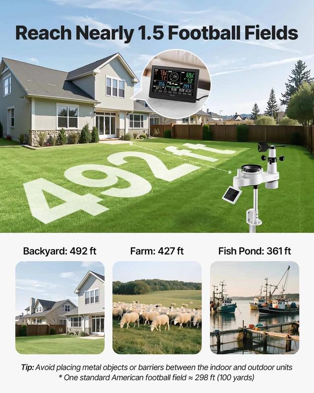 ·Long Transmission Distance: The outdoor sensor features 492 ft (150 m) transmission distance, ideal for rooftops, gardens, and farms. Avoid placing near TVs, towers, power lines, or other interference sources. Not ideal for mounting on metal fences