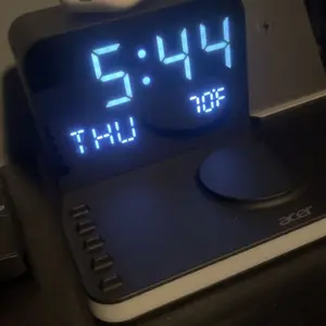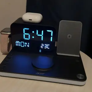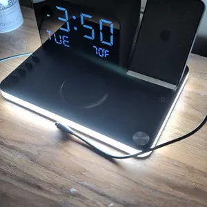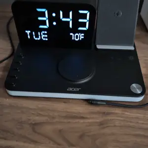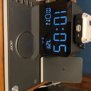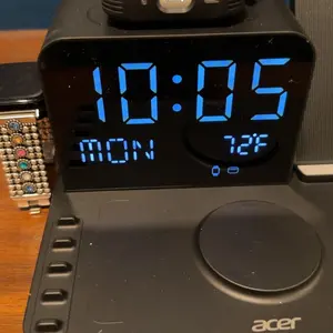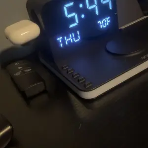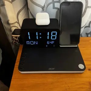 An amazing charging station that can wirelessly charge two phones, one watch and one pair of ear bugs at same time. The time keeps in sync with my phone's Bluetooth. 2 wired USB-C USB-A 20W outputs, night light brightness can be adjusted. and a 30w adapter is also included.