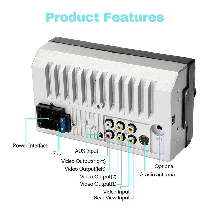 Main function:MP5,USB/TF interface, AM/FM,Bluetooth,Rear Camera input, Aux In