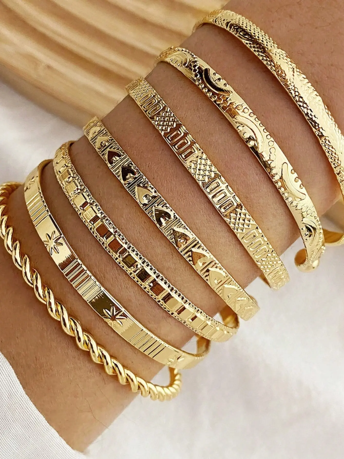 ✨ Discover the 7Pcs Diamond Twist Adjustable Boho Bracelet Set! This set includes seven pieces of alloy open bangles, perfect for women who love minimalist yet chic jewelry. The bracelets are hypoallergenic and washable, ensuring comfort and durability. Ideal as a stackable piece, they add versatility to any outfit. A thoughtful gift for friends or yourself.