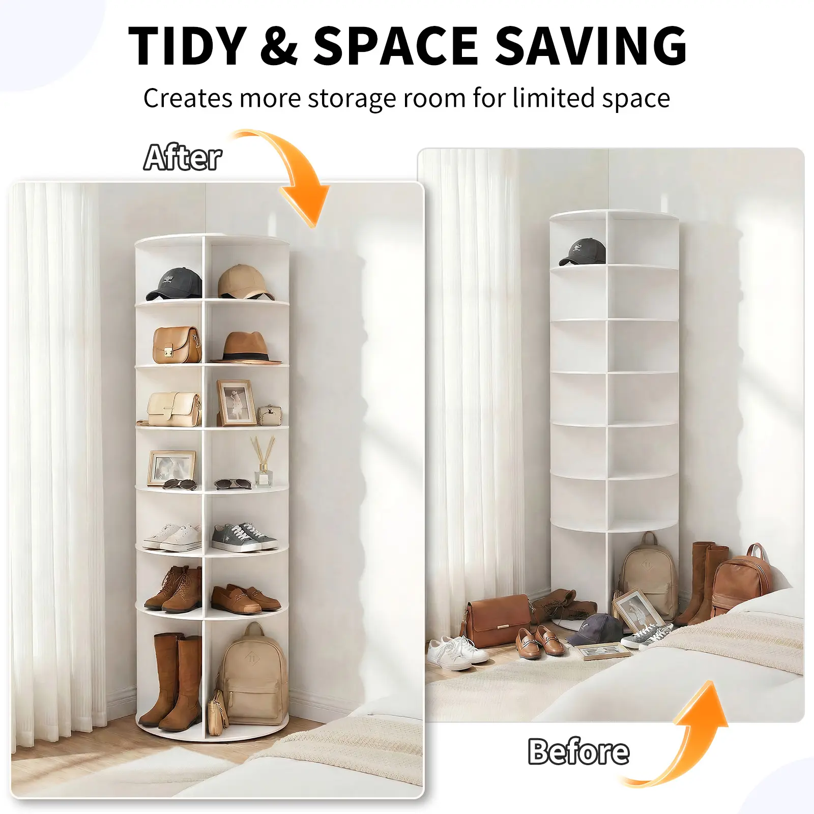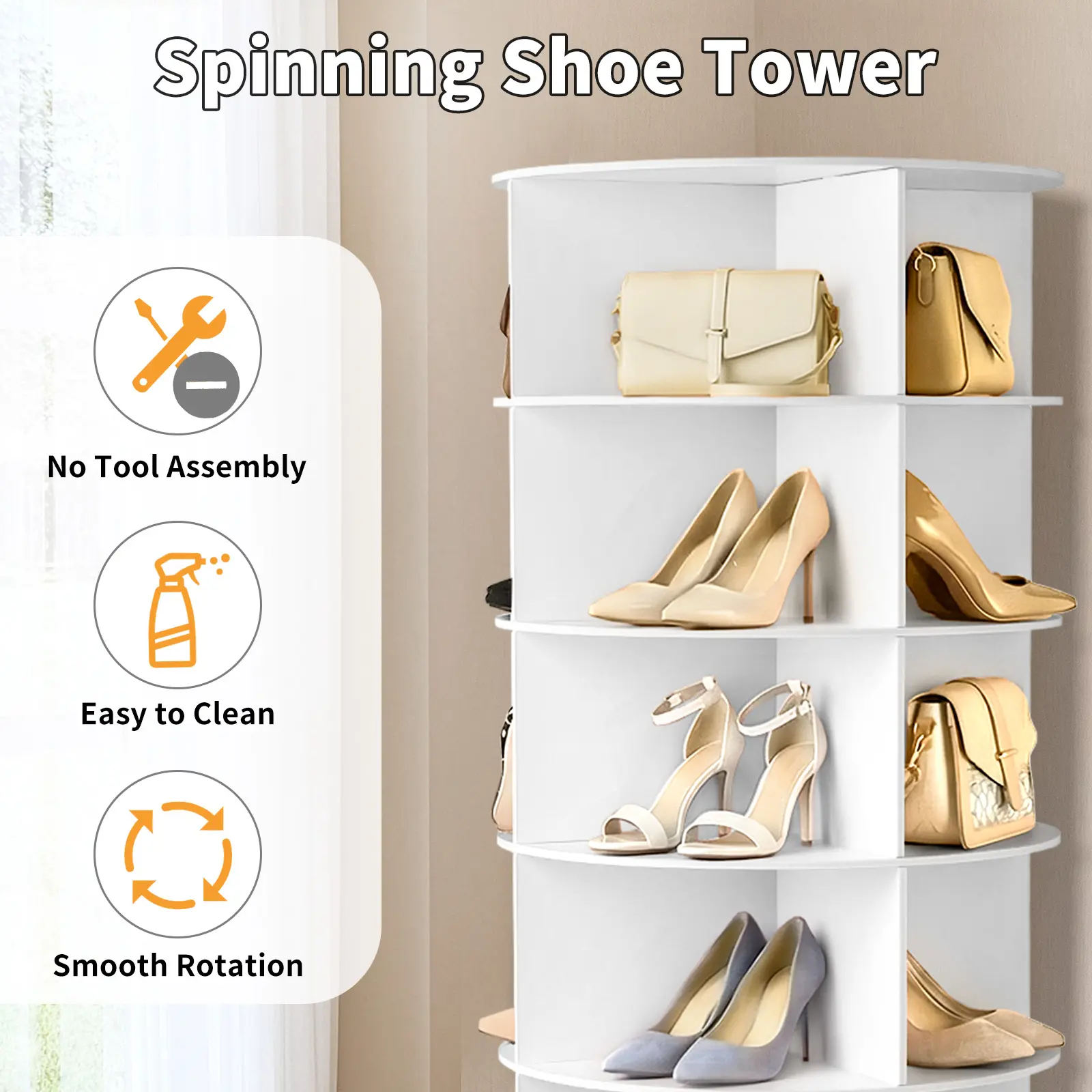 Superior 360-Degree Rotation Mechanism: This shoe rack's core feature is its full-circle rotating design, supported by a high-quality bearing system that ensures a smooth and stable spin. This innovative functionality eliminates the need to awkwardly reach or walk around the unit to find a specific pair of shoes. You can simply rotate the entire rack to bring any tier directly to you, saving time and effort while providing a delightful, interactive storage experience that makes organization both practical and enjoyable.
