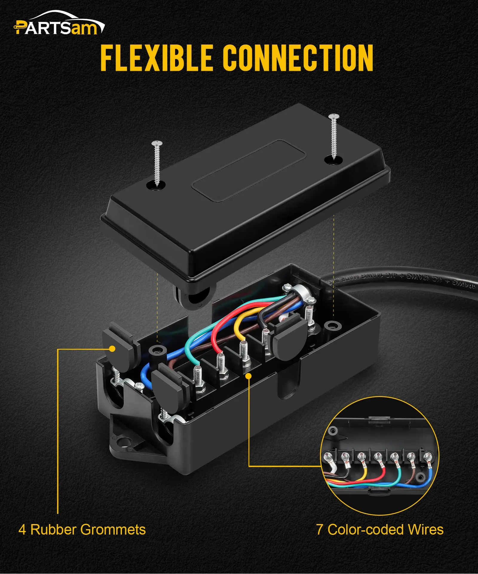 [Sturdy Junction Box] Enjoy convenient trailer wiring with a sturdy junction box. It features color-marked 7-poles for a hassle-free wiring experience for the left/right turn light brake signal lamp, reverse light, and tail light. It's much more manageable than handling loose wires.