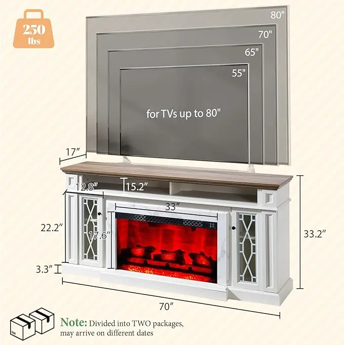 VERSATILE ENTERTAINMENT CENTER: Use it as a media console table for your media devices or as a display table for small decor items in living rooms and bedrooms. TV Console: 70"W x 17"D x 33.2" H. Fireplace: 33"W x 17.6"H. Suit TVs up to 80"