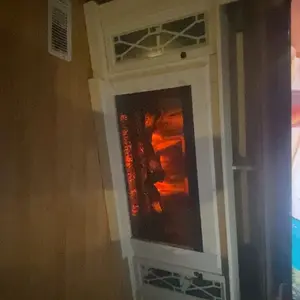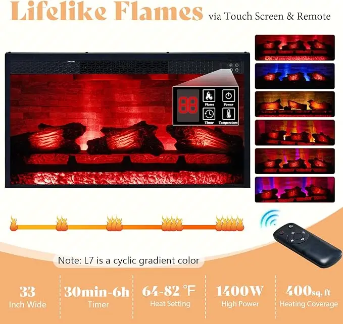 33" WIDE FIREPLACE: 33in detachable fireplace enhances the integrity and aesthetics of the entire product. Unique brick wall backdrop enhances the realism of the burning process of simulated logs. 6 flame colors, 5 levels of brightness,m 0.5-6h Timer, 64-82℉ temperature adjustment, easy operation via touch screen & remote