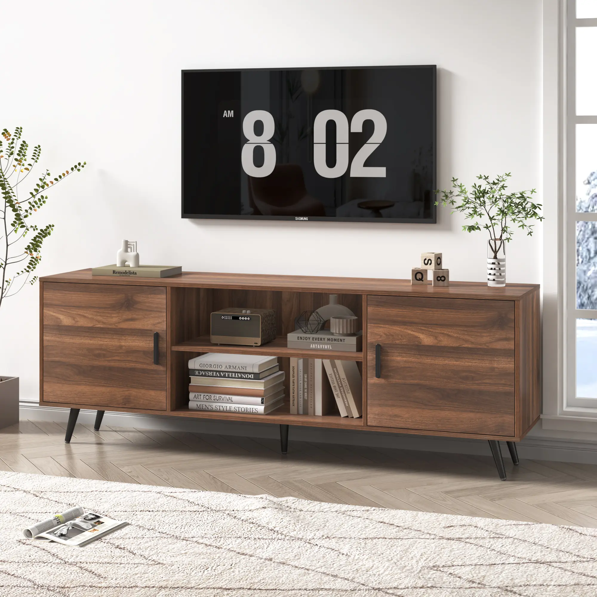 2. Modern Mid Century TV Stand: Featuring a classic two-door design with a mid century look and pine legs, the simple lines of the long TV stand design can easily be incorporated into a variety of decorative aesthetics to enhance the look of any room.