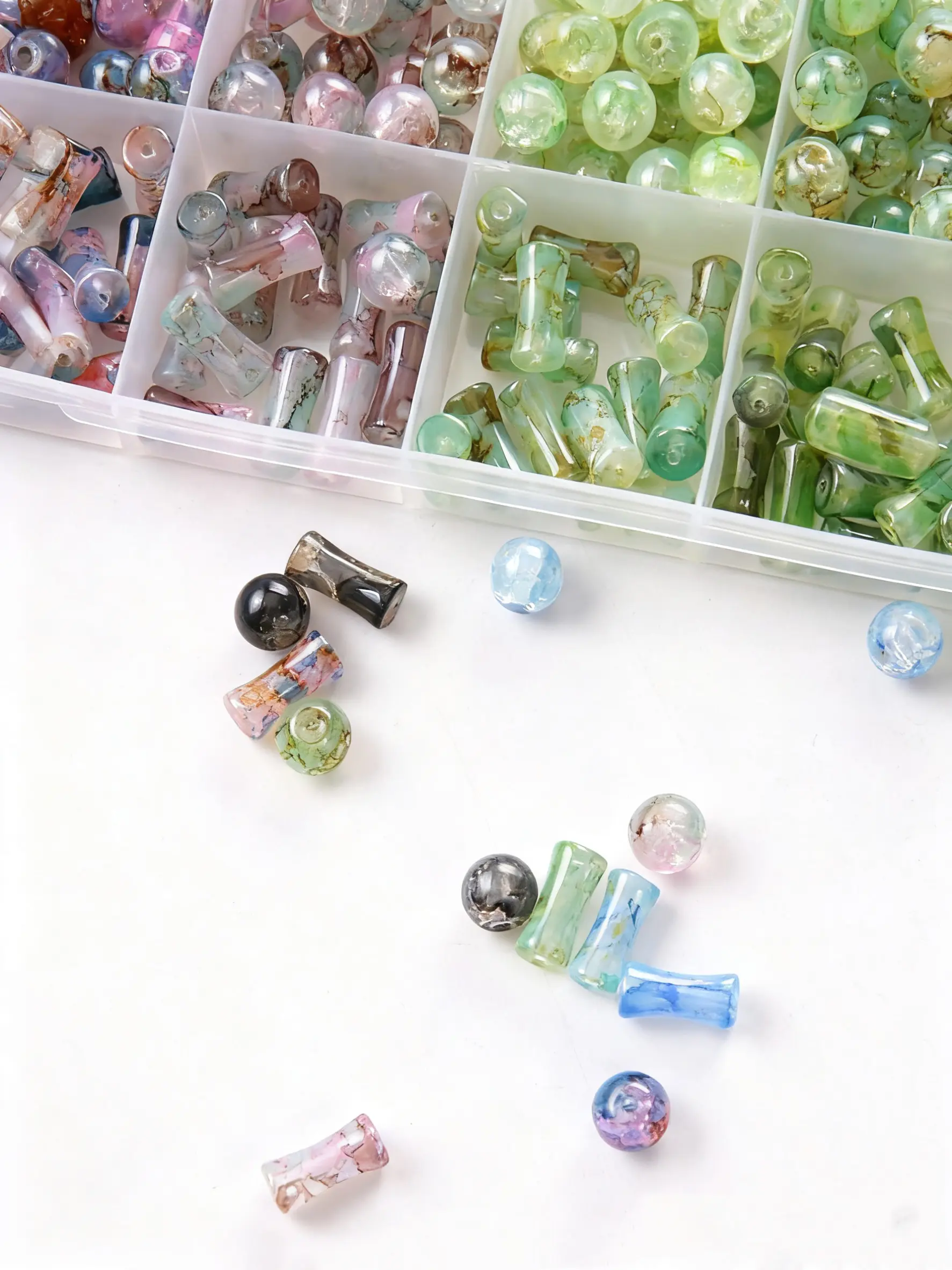 Someone had bought me this case of beads as a gift and they were so beautiful. The color was so beautiful and in this one there’s only about half as many beads in the container as there was in all of their colors are off. They’re not the same colors they’re very similar, but not looks cheap!