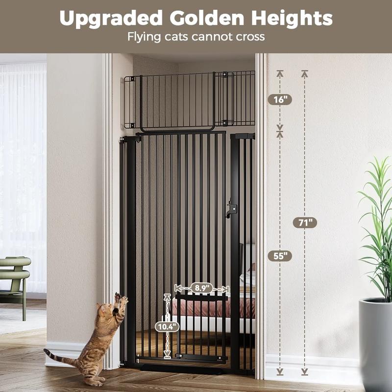 ·71" Extra Tall x 40.6" Wide : The cat gate is 55.1" tall, with 3 removable 15.7" panels that extend it to 71" tall. Fits 29.5" to 40.6" openings, extra tall cat gate ideal for your kitchen, doorways, and stairs. Keep your lively kittens where they belong – no more escape artists