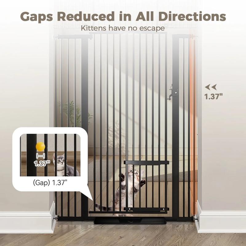 ·1.37″ Utral Narrow Gap: The gaps between each two bars are only 1.37", which effectively prevents small or curious pets from getting caught or escaping. For added safety, if the gaps are too wide at the two ends of the pet gate with cat door, 2 spacer bars are provided to reduce the width