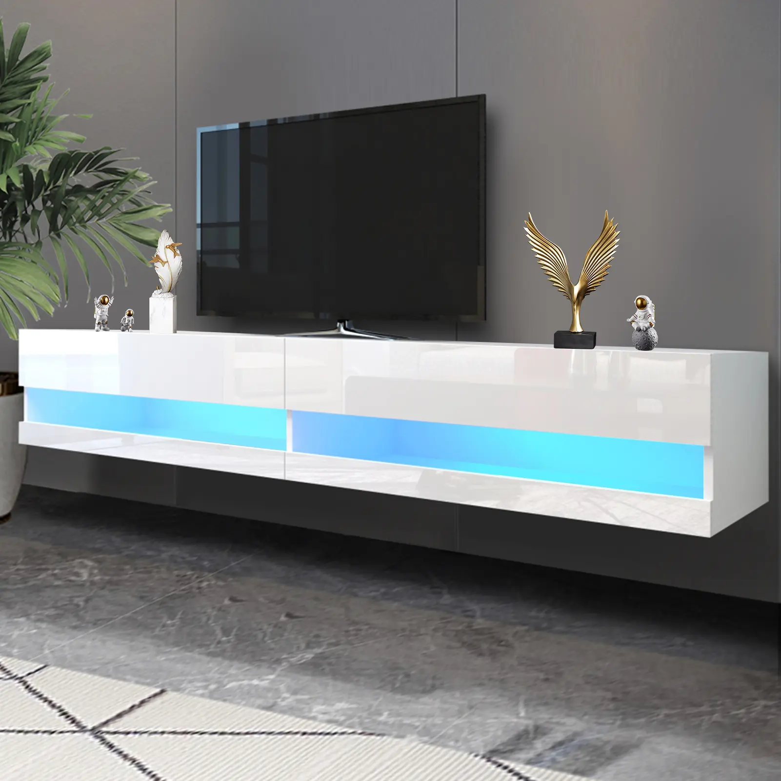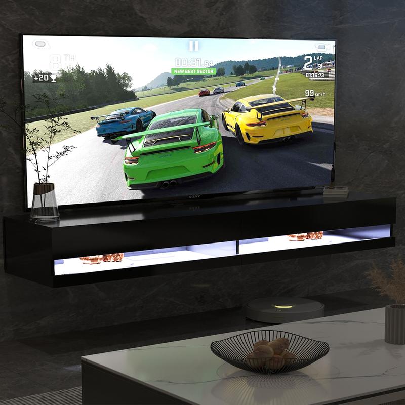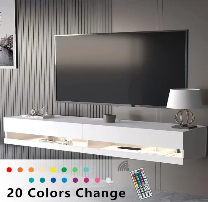 【Adjustable LED Lights and Power Outlets】The floating TV station is equipped with 16 color adjustable led system. In addition, TV cabinets have wire managers to hide your wires, which is convenient for wiring and convenient for customers to use electronic equipment.