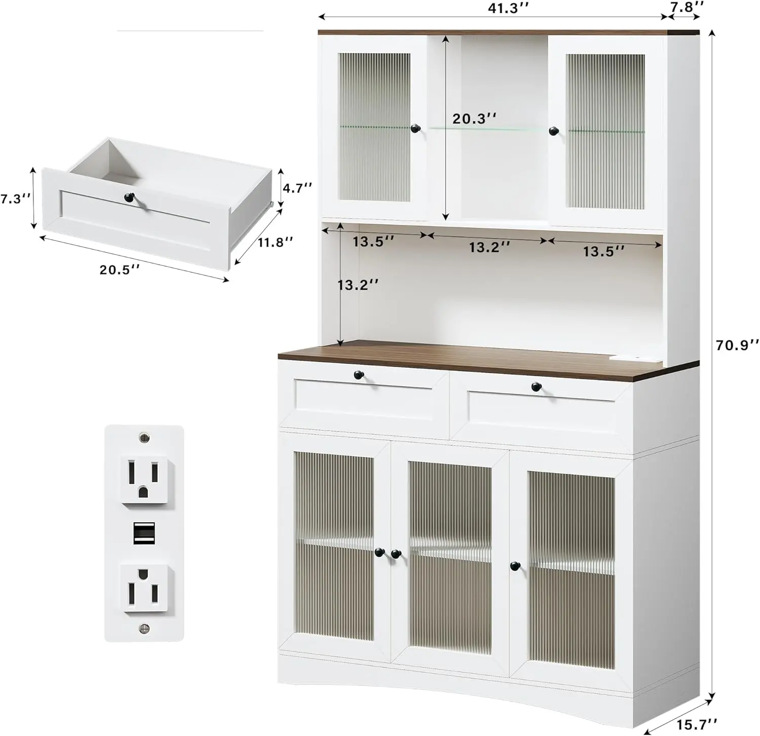 ·Large Capacity & Versatile Pantry Cabinet:This tall pantry cabinet combines a coffee bar, buffet, and storage in one! With 10 compartments, 5 adjustable shelves, 2 deep drawers, and a spacious open countertop, it easily organizes cookware, dinnerware, and pantry essentials. The flexible design adapts to your changing needs while enhancing your kitchen’s style.