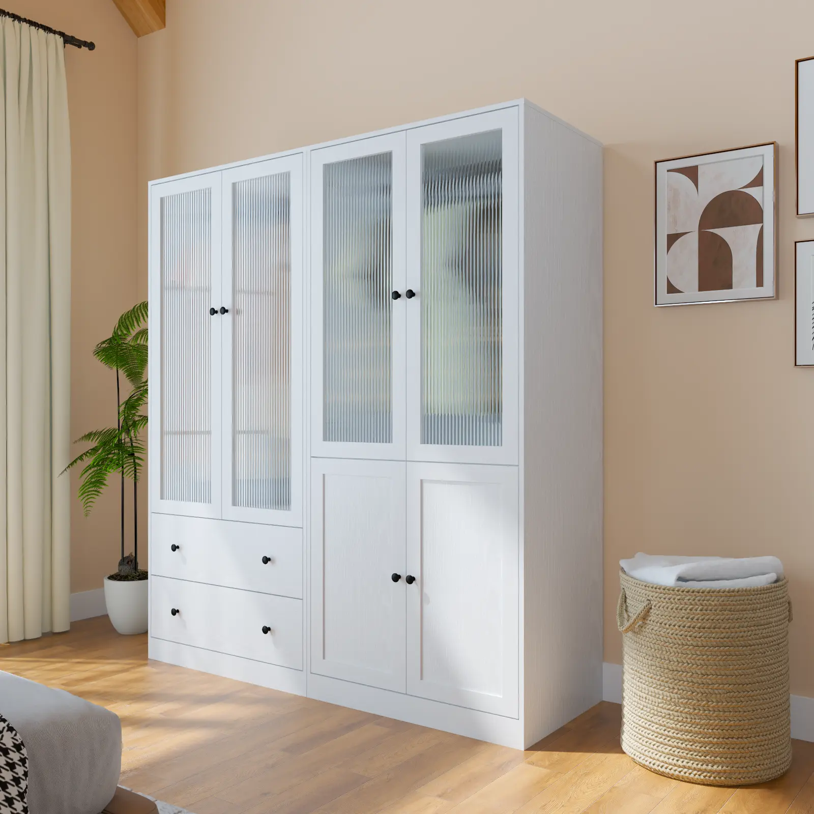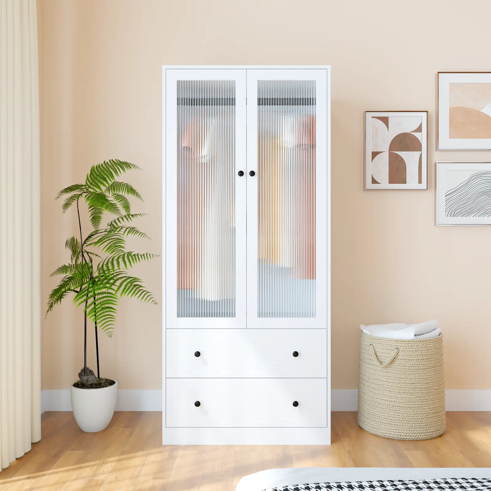 Crafted in wood with a modern minimalist aesthetic, this wardrobe combines clean lines with refined details. The fluted glass doors add elegance while keeping dust out. Blends seamlessly into bedrooms, kids rooms, hallways, or living rooms—enhancing both function and style.