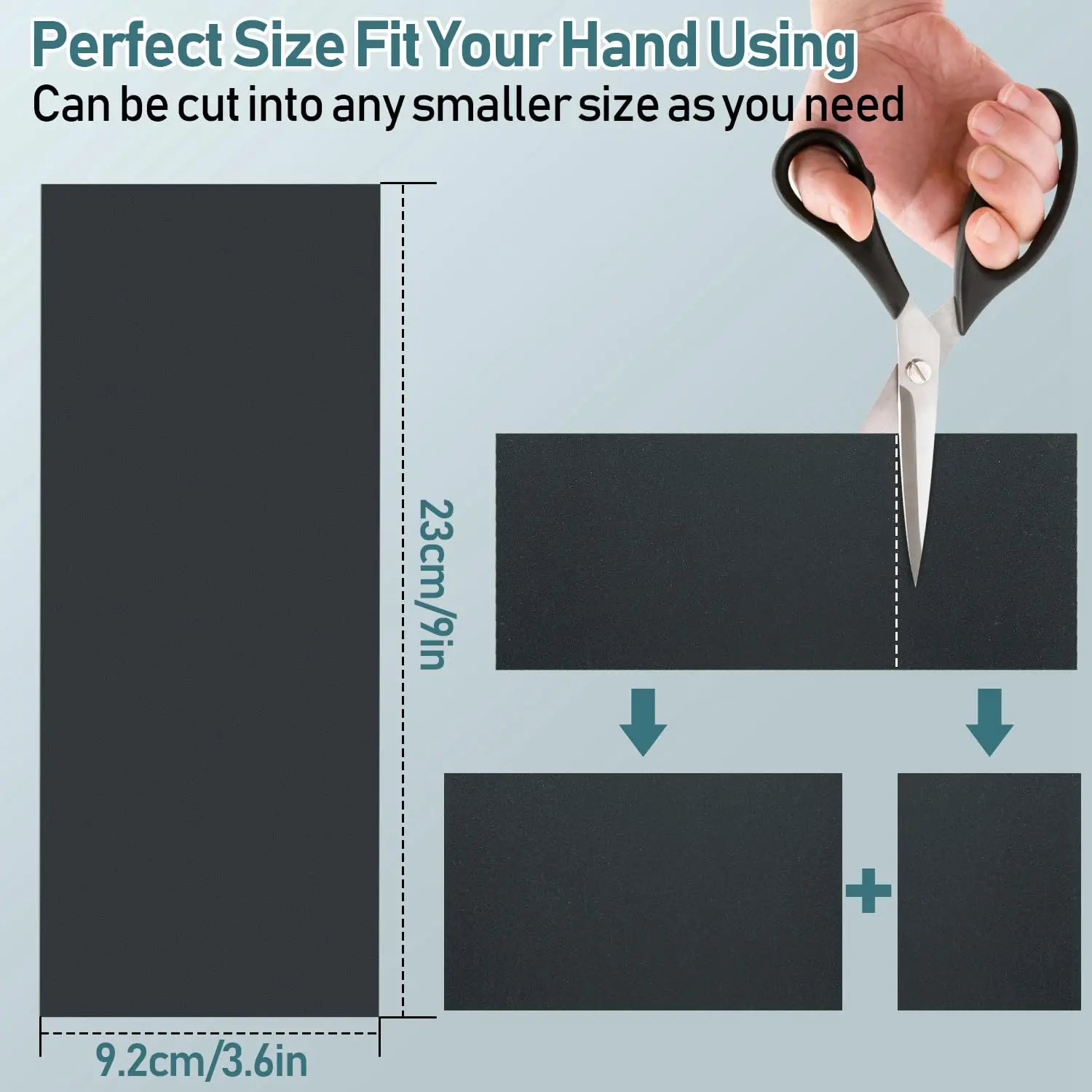 Flexible Size: 9 x 3.6 inch, can be easily cut into any size to fit your hand or sanding tools. Soft-backed sandpaper ensures good hand grip and can be to polish objects smoothly with only moderate effort, with high resistance to slipping or loose during use