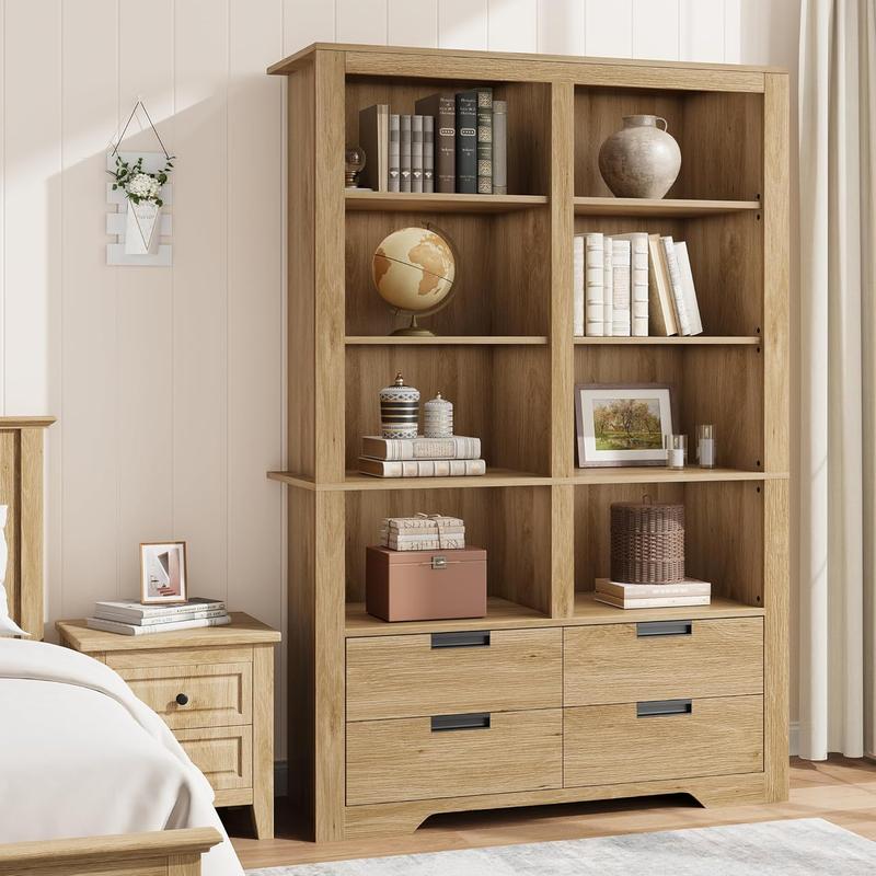 This double wide bookcase has 4 drawers and 8 shelves which can keep your items in good order and provide ample space for storing products Rational layout of open shelves and drawers works perfect for home display and storage Making it easy to classify your collection of books photo albums delicate trinkets