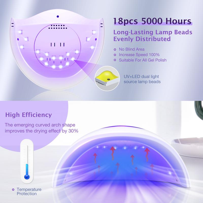 The UV nail lamp uses 18 lamp beads, which are distributed on the top,left and right sides in the nail dryer. This can be used to bake the GEL nail polish more comprehensively.