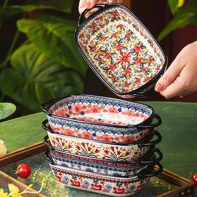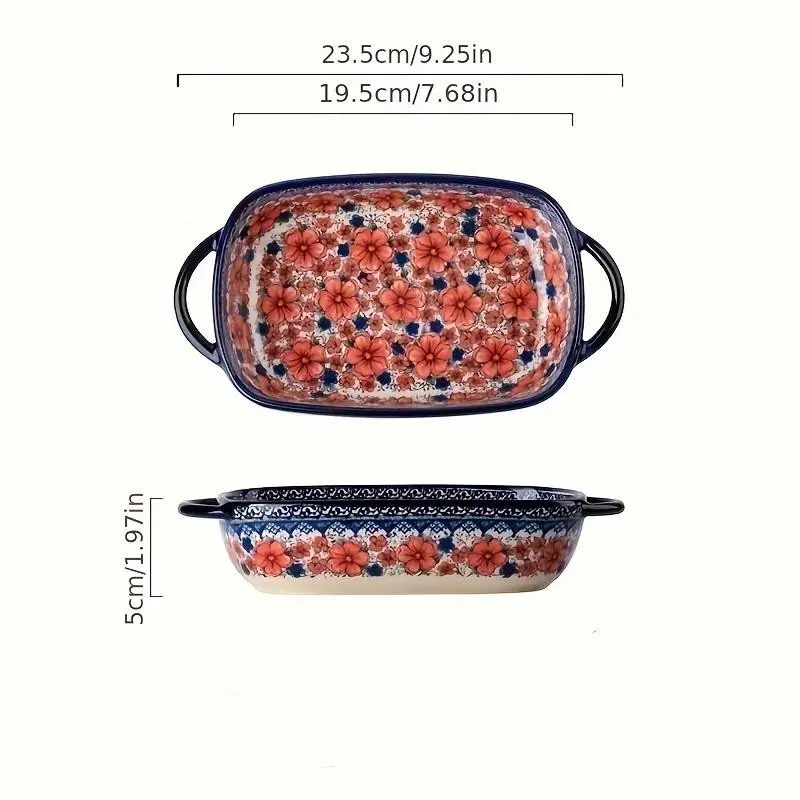 730ML Floral Ceramic Baking Dish, Rectangular Serving Dish with Handles, Ideal for Rice, Salad & Cheese, Elegant Kitchen Essential
