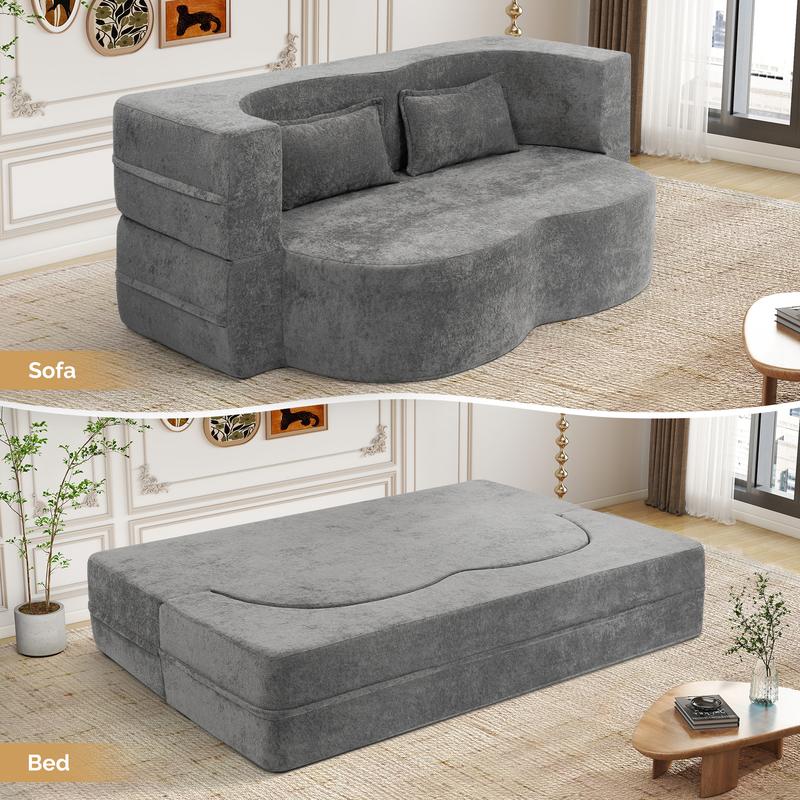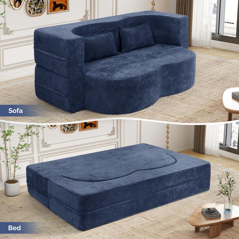 ·2-in-1 Convertible Curved Sofa Sleeper:This sofa bed converts between two functions. During the day, it's used as a stylish curved sofa to add a touch of elegance to your living space. But come nap time or nighttime, simply flip the seatback section and lay it flat on the floor - and in no time, you'll have a full-size sleeper or mattress for a peaceful night's sleep. Perfect for small flats, guest rooms, or any space where function meets style.