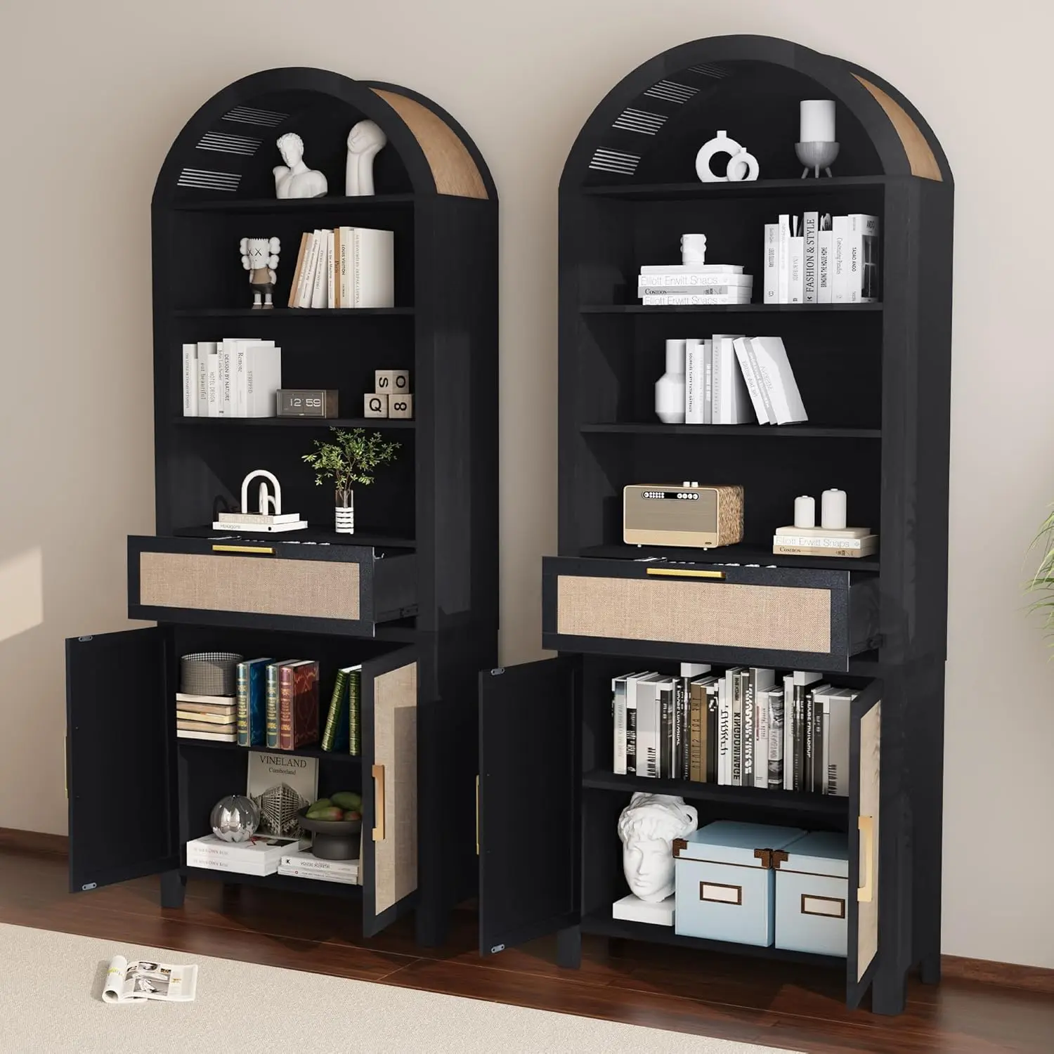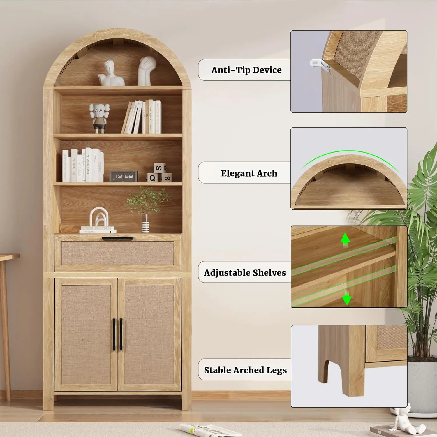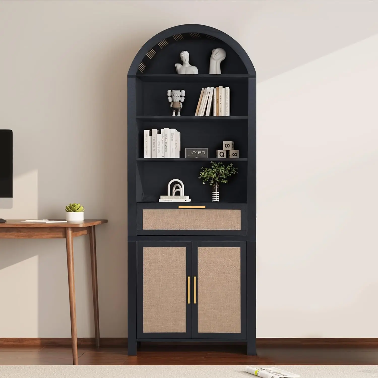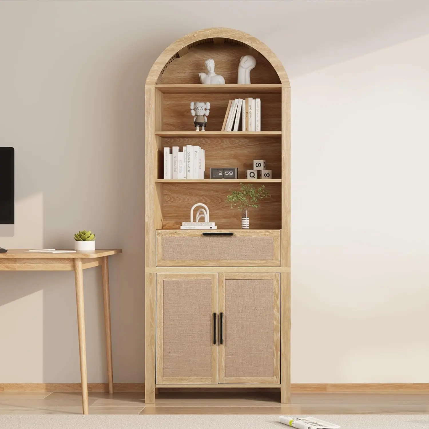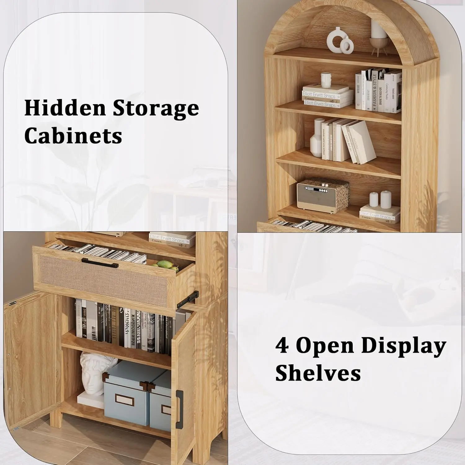 ·【Multi-Functional Use】 Perfect for use as a food storage cabinet, bookshelf, display cabinet, or pantry, this arched bookshelf adapts to various scenarios in your bedroom, living room, home office, kitchen, or reading room