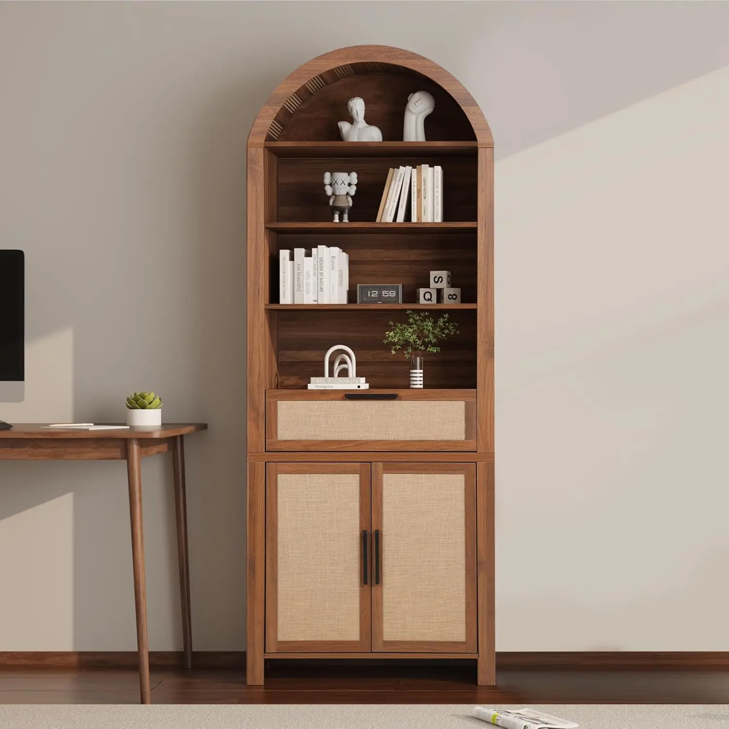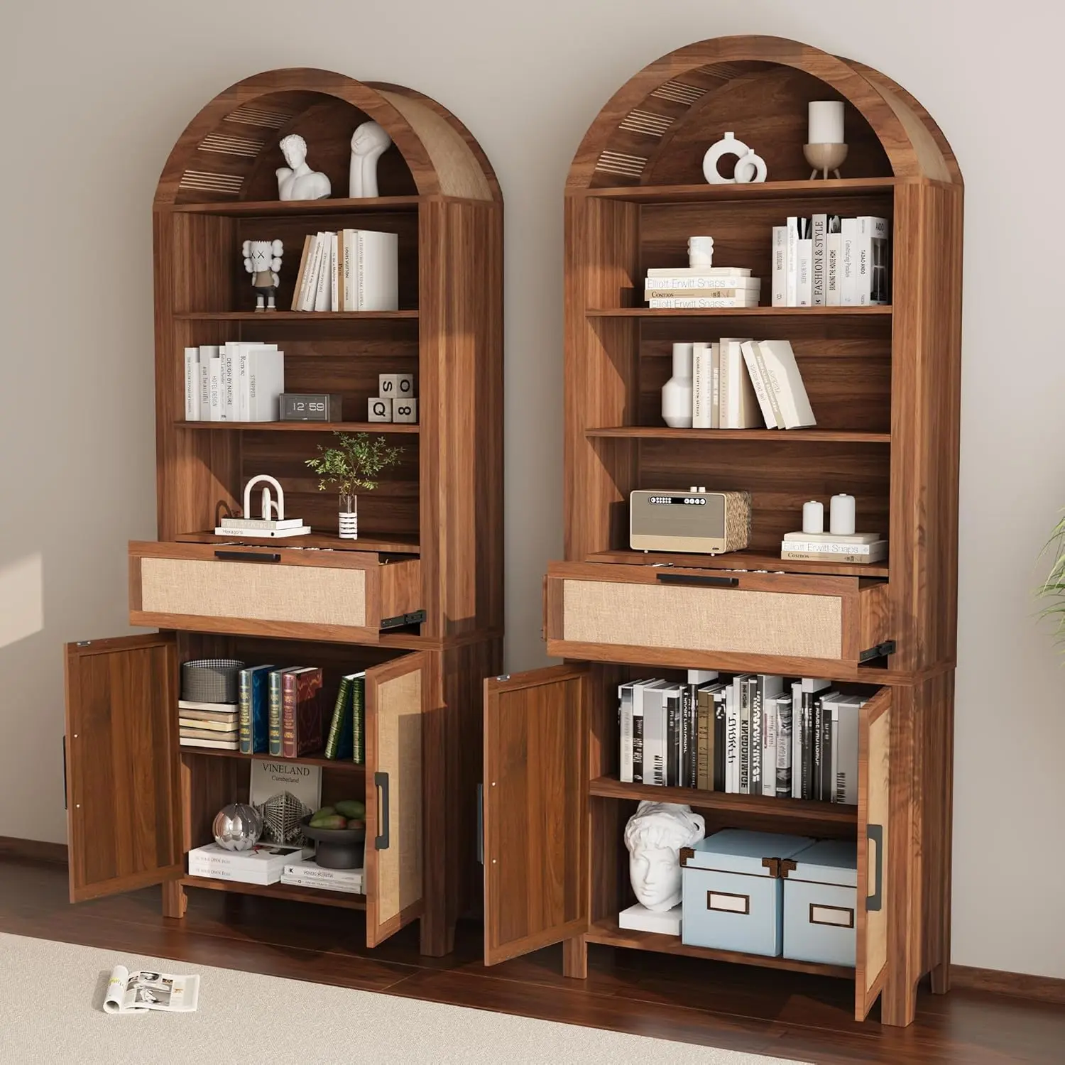 ·【Versatile Storage Solution】This arch storage cabinet provides a practical and stylish solution for a variety of needs. The lower part includes an openable 2-door cabinet and a storage drawer with metal handles and adjustable shelves, perfect for storing kitchen essentials, office supplies or personal items. The upper part boasts a 4-tier open arched bookshelf, and the middle 2 tiers come with adjustable shelves, each shelf can bear 44 pounds