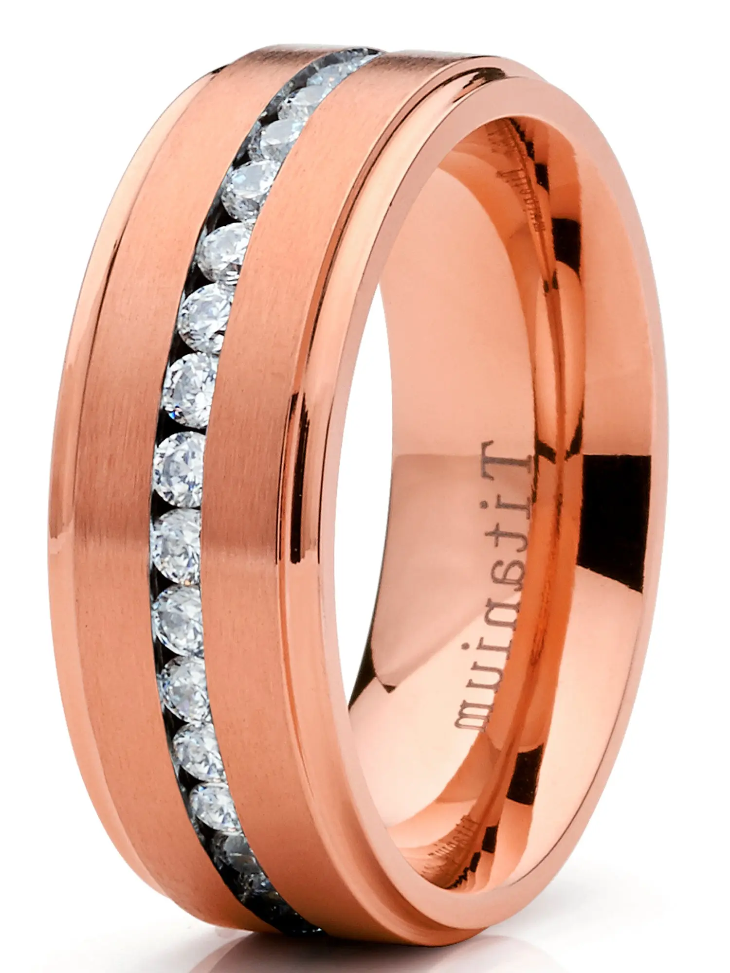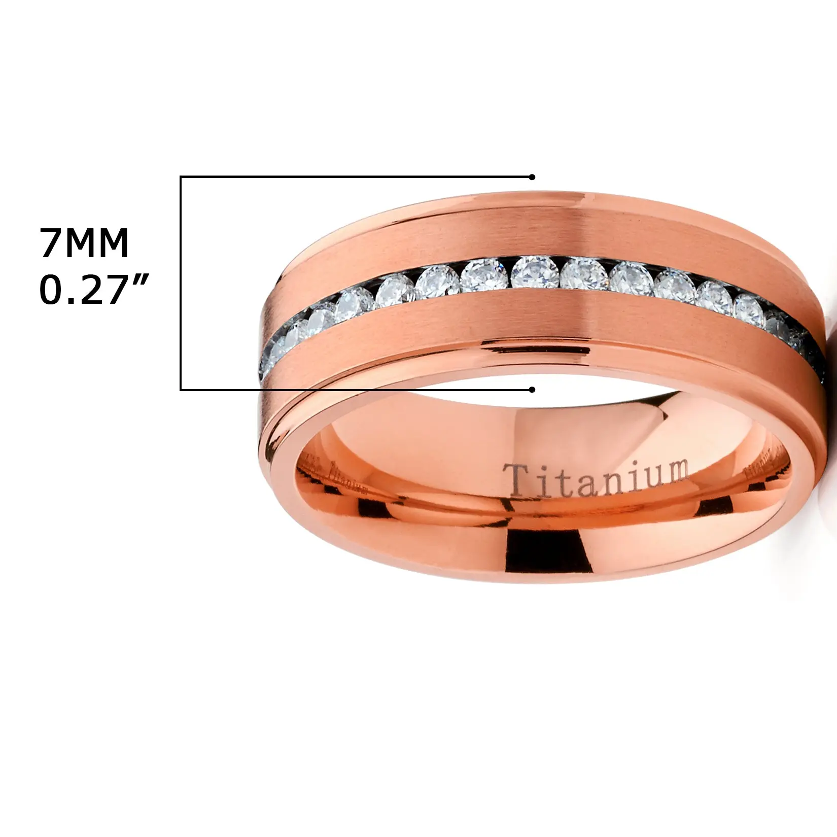 Lustrous, clear round-cut cubic zirconia gems are set in this men's titanium eternity ring fusing a stylish elegance with a simplistic masculinity. The 7mm rosegold-tone band features high polish stepped design that adds depth and allure to the gem settings, making it the ideal way to symbolize your eternal vows.