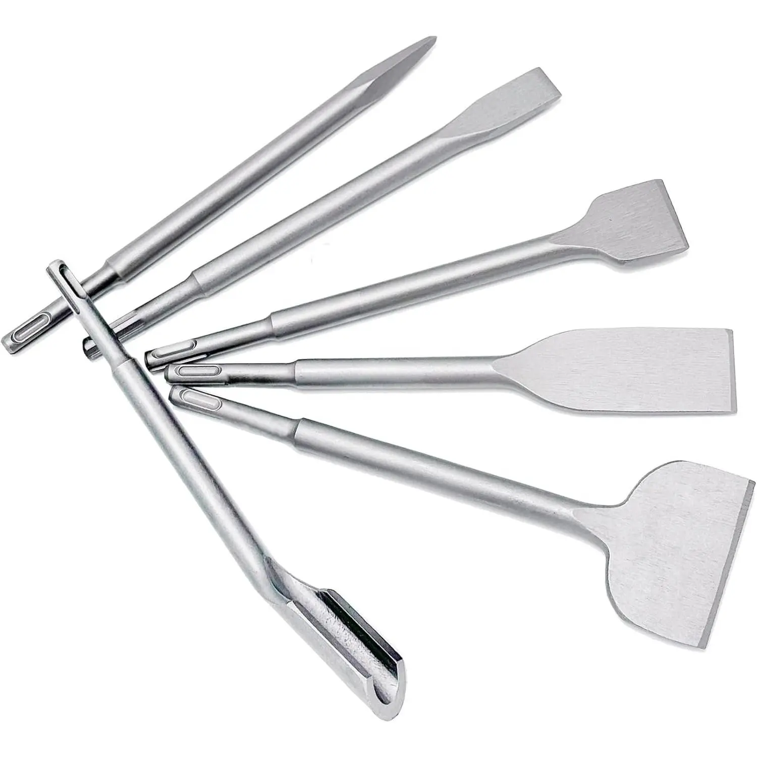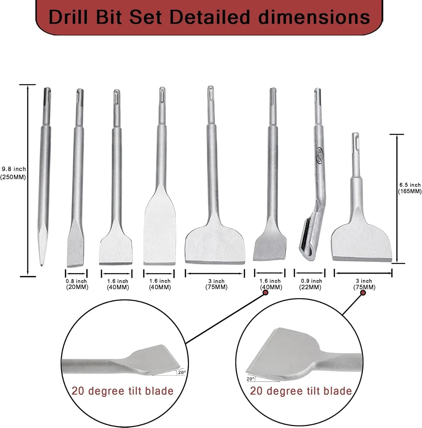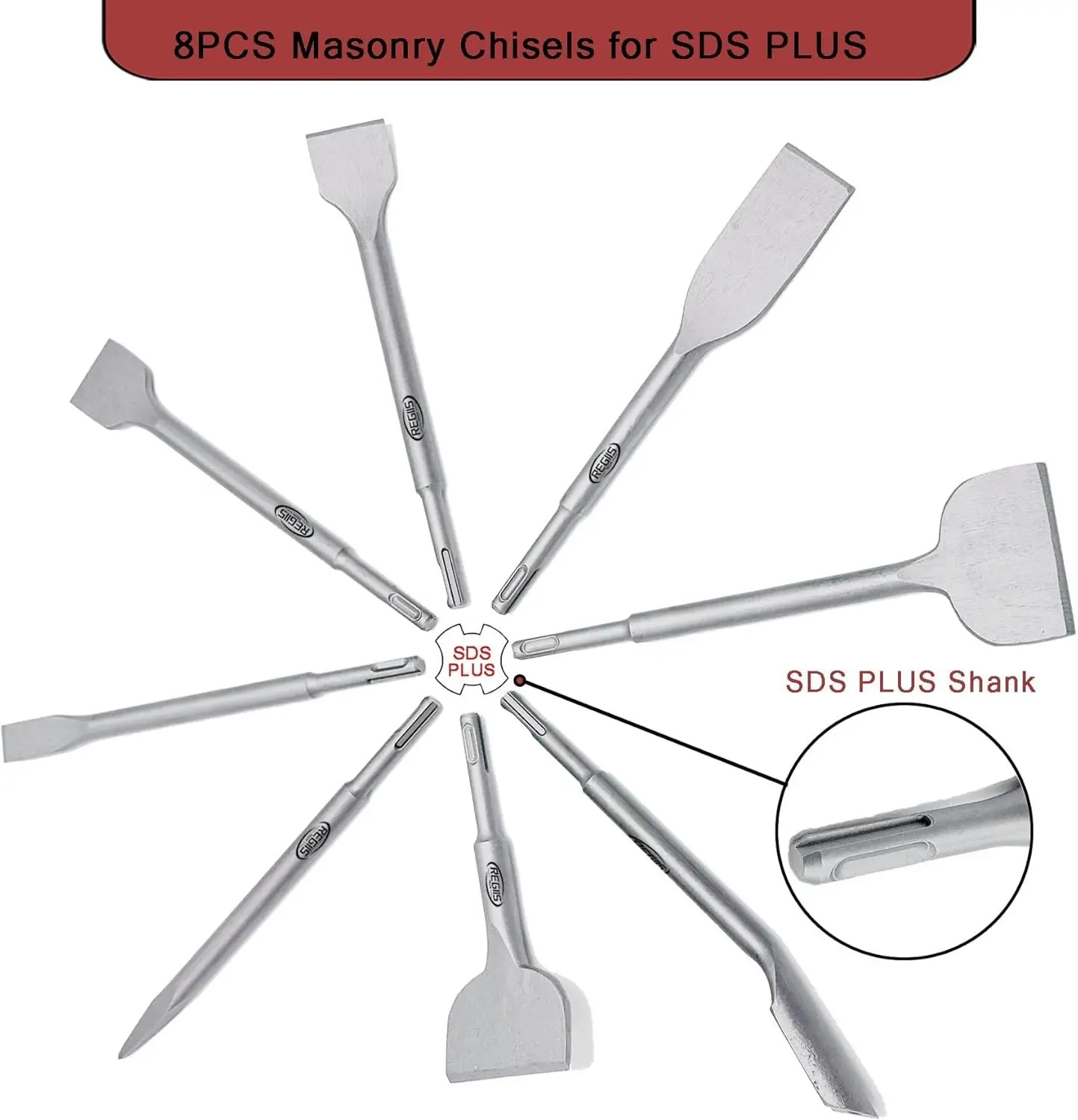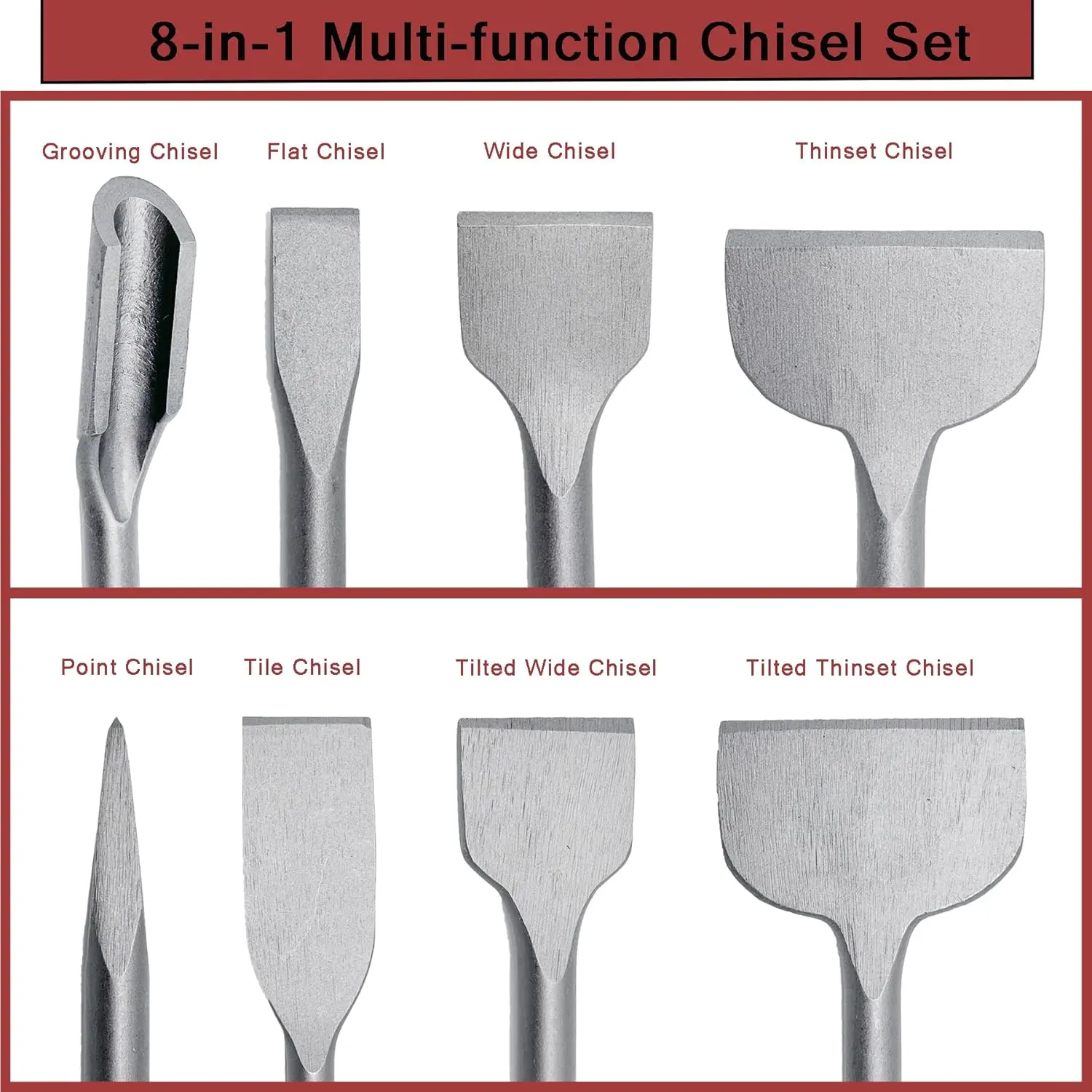 8- set: The 8- chisel set includes tile chisel, groove chisel, scraping chisel, flat chisel, pointed chisel and scraping chisel and angled chisel*2, quickly and easily replace each SDS Plus drill bit to handle different demolition jobs. Whether it is indoor tiles, floors or outdoor concrete, bricks can be easily handled.