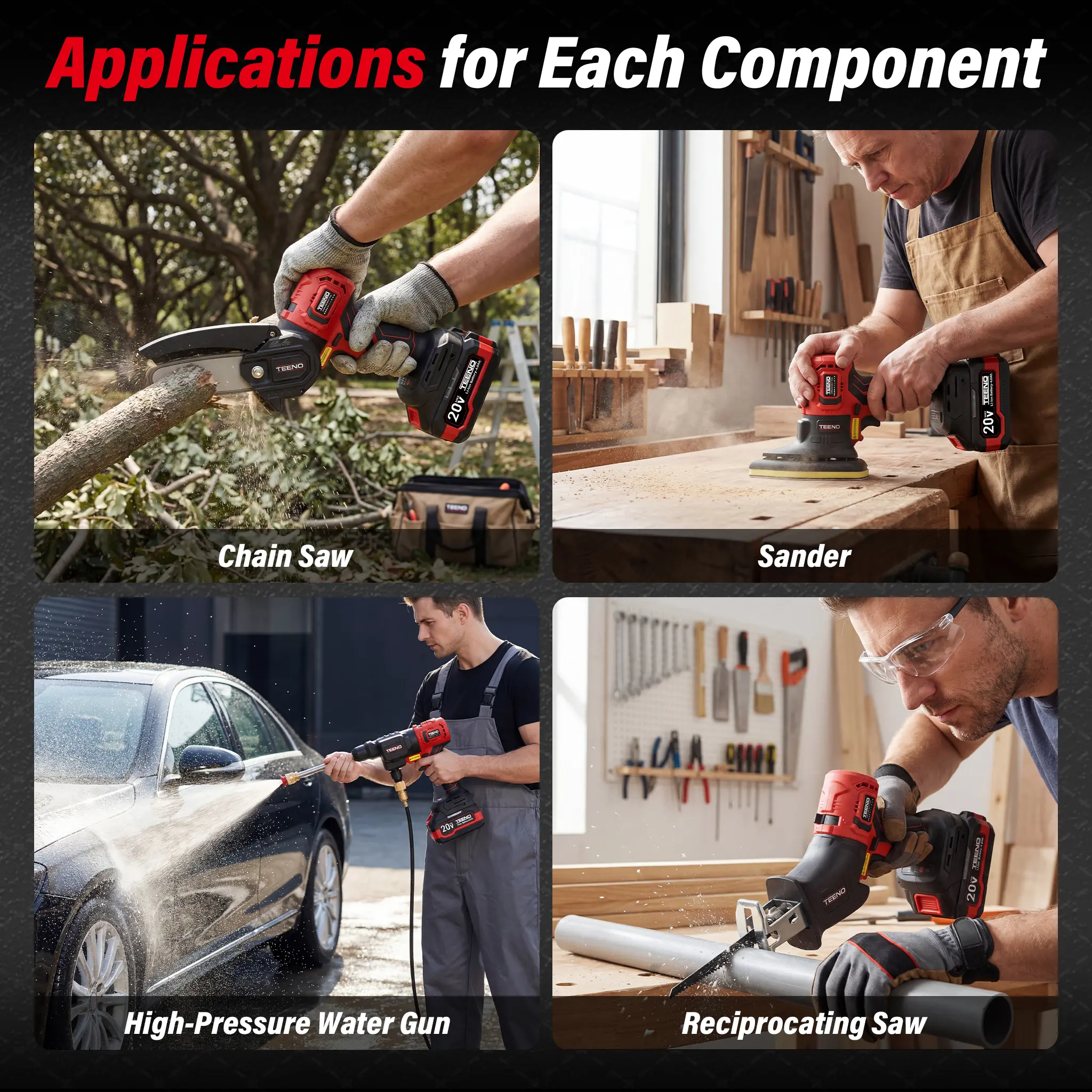 “10-IN-2 size”:This versatile 20V power tool set features 10 interchangeable heads, including a chain saw, angle grinder, reciprocating saw, impact driver, circular saw, sander, leaf blower, high-pressure water gun, drill driver, and buffer. Ideal for cutting, grinding, sanding, cleaning, and more—perfect for DIY, home improvement, and yard work.Powered by two 20V 4.0Ah lithium-ion batteries