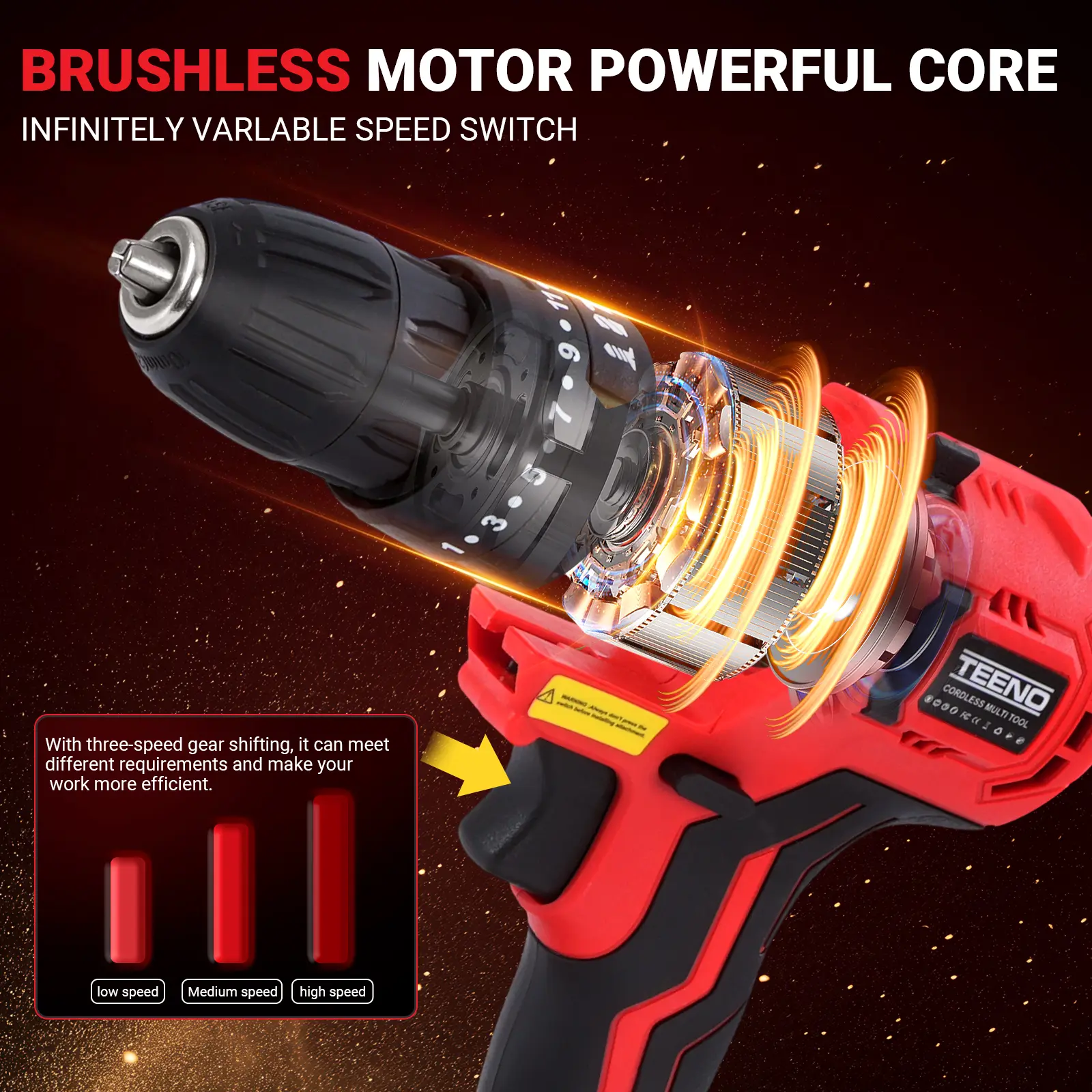 “3-IN-1 size”: including a variable speed drill/driver, impact wrench, and oscillating tool—three tools in total—paired with a 3.0Ah lithium-ion battery and a toolbox