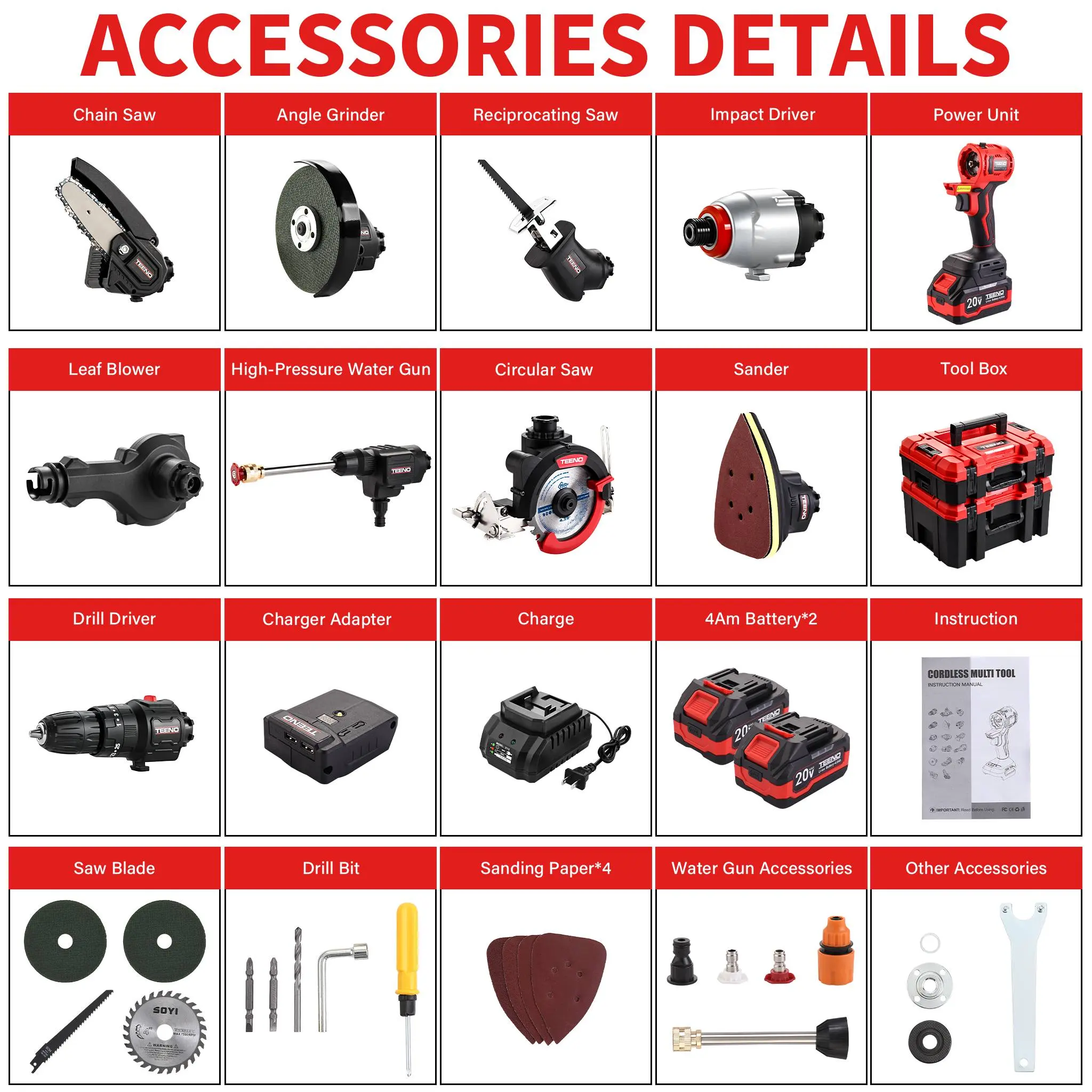 The kit includes all necessary accessories for each tool. The variable speed drill/driver, impact wrench, sander, reciprocating saw, chain saw, and oscillating tool are ready to use right out of the box. Enjoy the flexibility of multiple tools in one set.