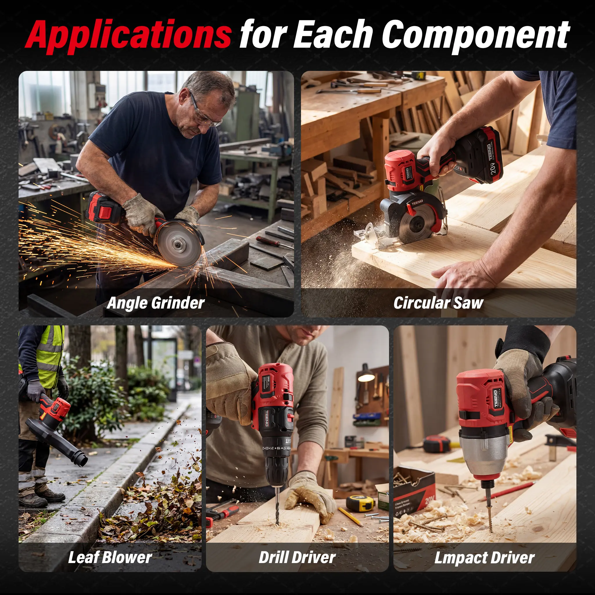 By purchasing our products, you will have a wide variety of power tools at your disposal. This kit includes a variable speed drill/driver, impact wrench, sander, reciprocating saw, chain saw, and oscillating tool. Six cordless power tools for your daily use. Perfect for various tasks around the home or workshop.