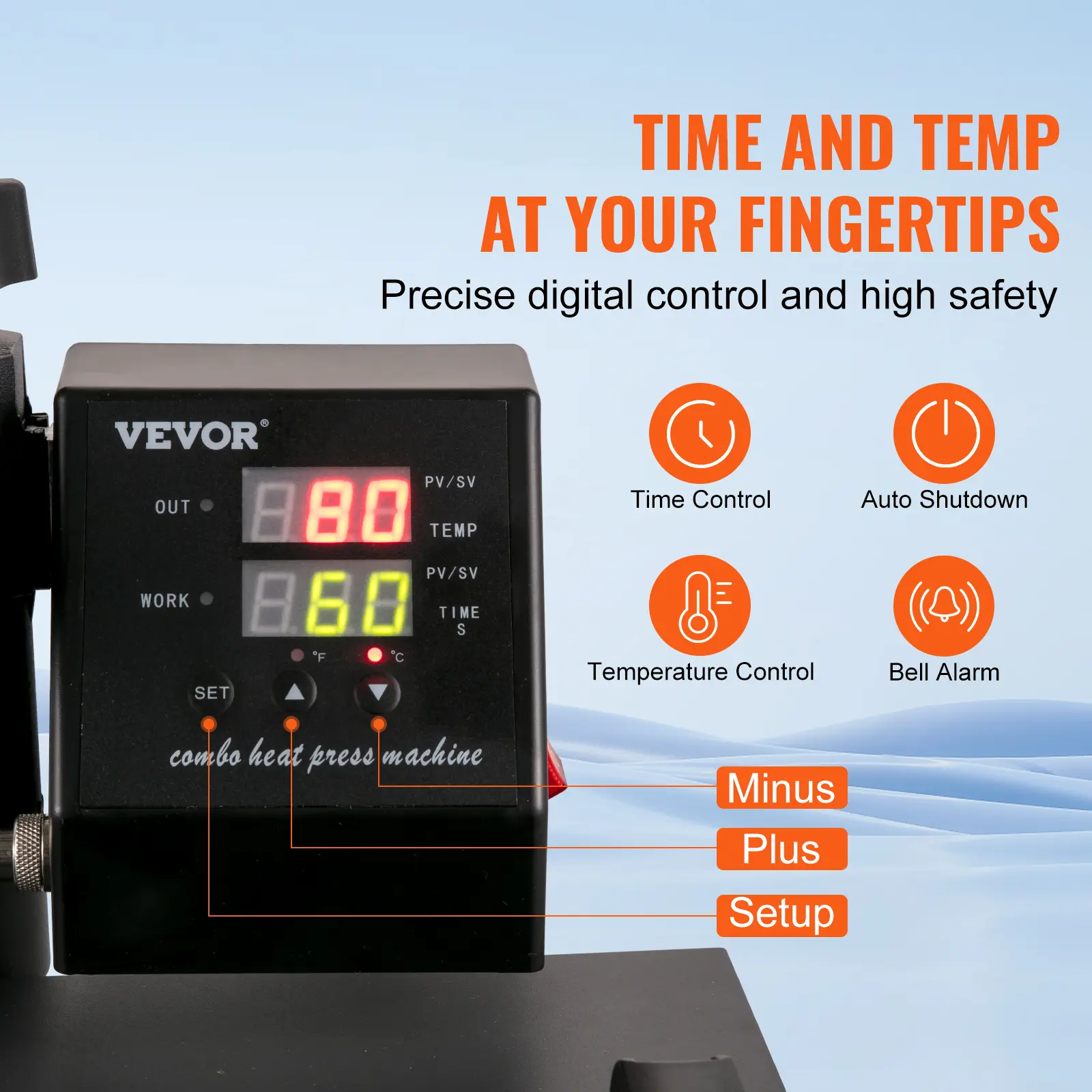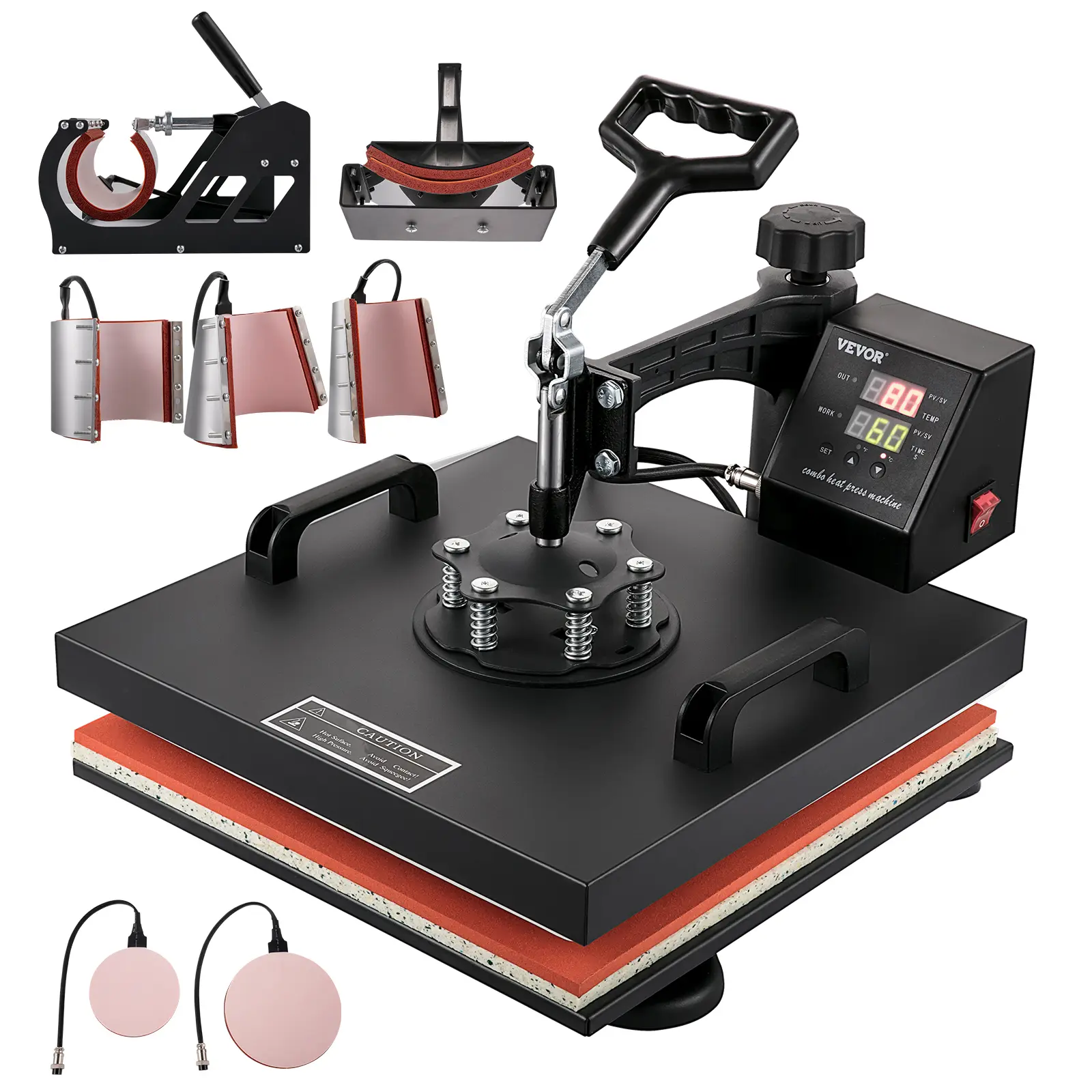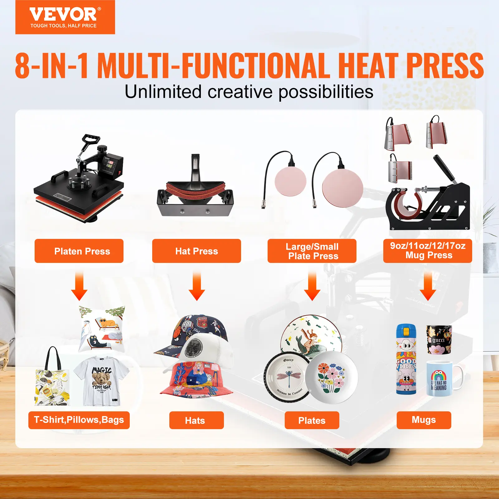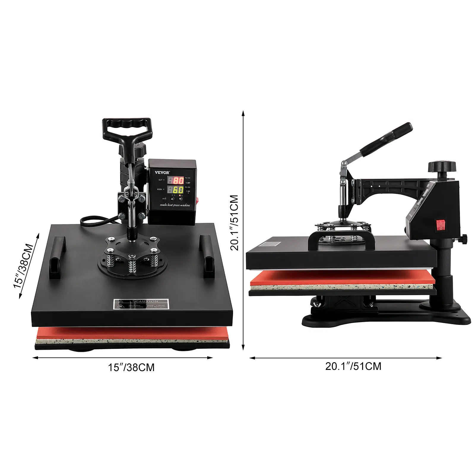 • 【8-IN-1 VERSATILE KIT】- With a 15" x 15" (38 x 38 cm) large heat platen, the shirt press machine uses Teflon-coated platen, non-stick & stable. Suitable for applying letters, numbers, and patterns onto caps, T-shirts, cups, plates, etc.