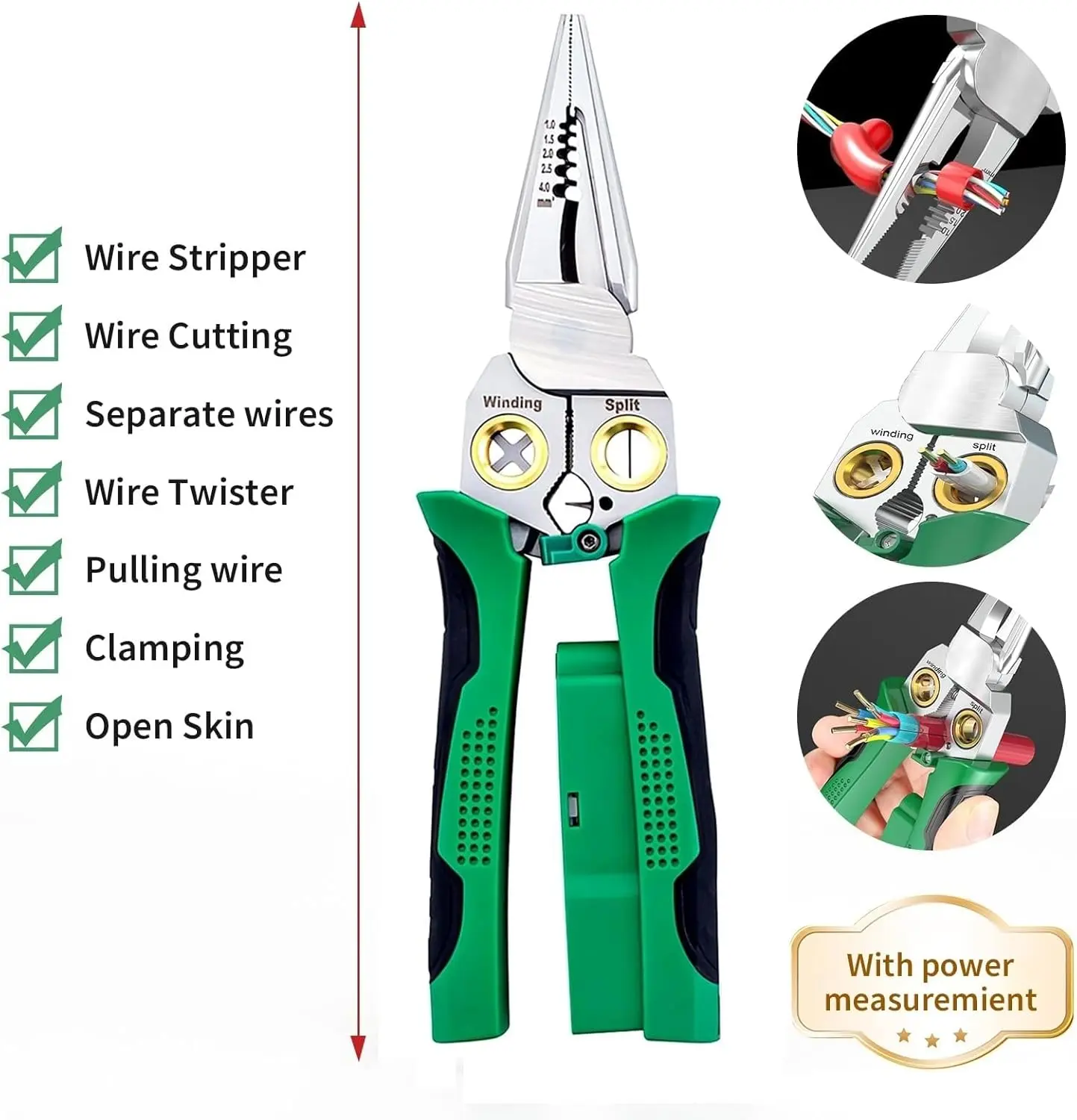 ·8-in-1 Wire Stripping Pliers With Voltage Test Feature, Offering Convenience And Accuracy For Electrical Work. Say Goodbye To Multiple Tools With This All-in-one Solution.suitable For AWG 18,14,12,10,6/1.0,1.5,2.0,2.5,4.0mm²; Cape Cable 25mm² Wire, Open Cable Outer Skin, Divide Wiring 2*1.5mm²