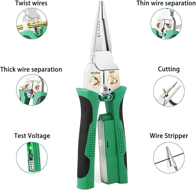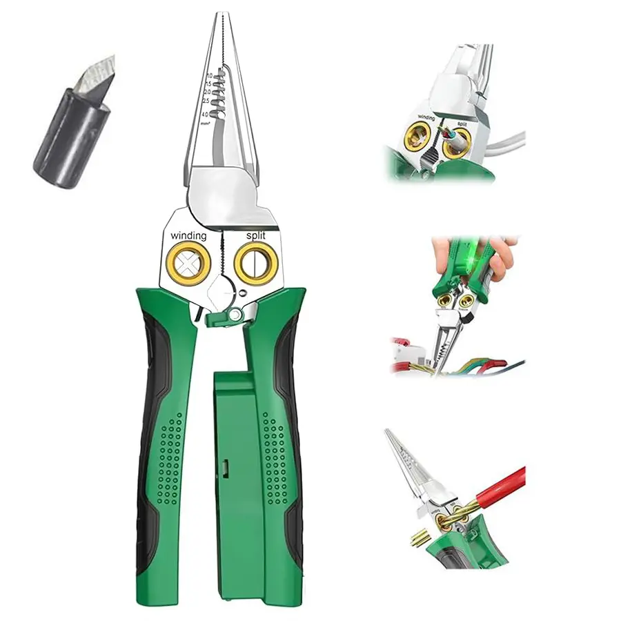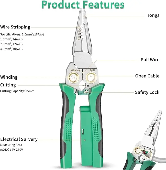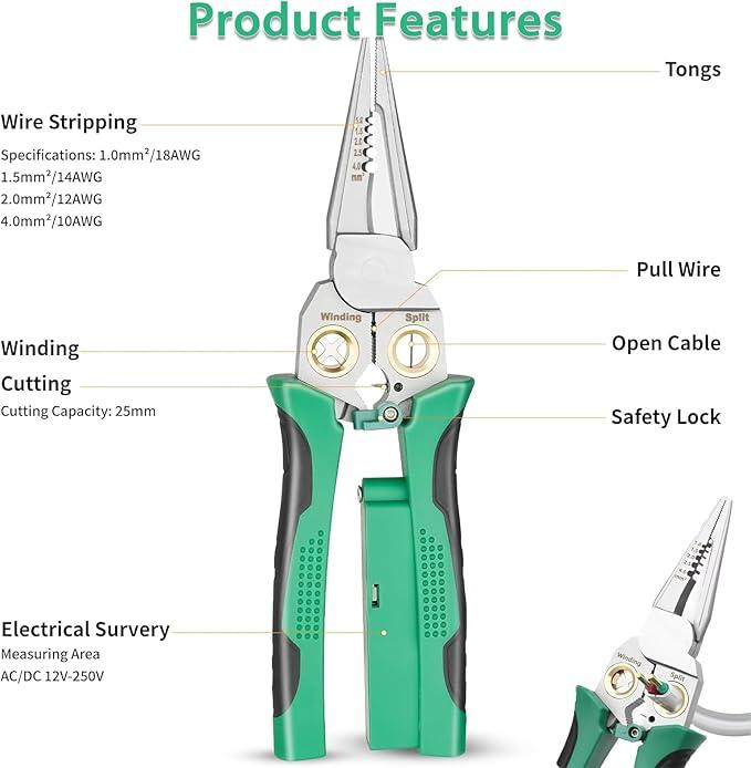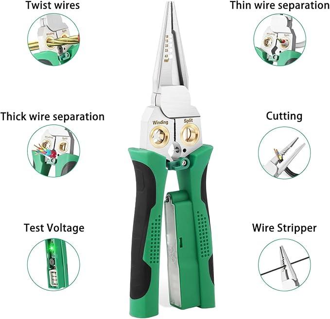 ·8 Tools in 1: Your All-in-One Electrical Solution: Ditch the bulky toolbox! Strip, cut, pull, scrape, press, twist, crimp, and open cable jackets effortlessly with this single, powerful pliers.