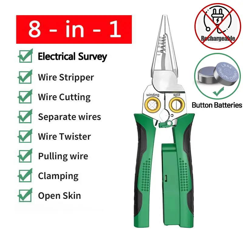 ·Multifunctional Wire Stripper And Twister With Electricity Measurement Function For Efficient Wire Cutting, Pulling, Scraping, And Pressing. Perfect Tool For Electricians And DIY Enthusiasts·8-in-1 Wire Stripping Pliers With Voltage Test Feature, Offering Convenience And Accuracy For Electrical Work. Say Goodbye To Multiple Tools With This All-in-one Solution.suitable For AWG 18,14,12,10,6/1.0,1.5,2.0,2.5,4.0mm²; Cape Cable 25mm² Wire, Open Cable Outer Skin, Divide Wiring 2*1.5mm²·Small And Compact Design For Easy Handling And Storage. Don't Let The Size Fool You, As This Wire Stripper Packs A Punch With Its Versatile Functionality·High-quality Cable Scissors For Precise Cutting And Stripping Of Electrical Cables. No More Struggling With Dull Blades Or Uneven Cuts·Professional-grade Wire Stripper Crimper For Reliable Wire Connections. Save Time And Effort With This Efficient Tool, Perfect For Electrical Projects Of Any Scale