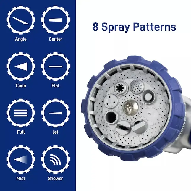 8 spray patterns with a high-flow design, providing customizable performance for various tasks like watering plants or cleaning outdoor surfaces
