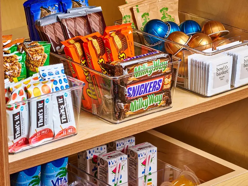 ·CUSTOMIZABLE COMPARTMENTS – FIT ANYTHING! Each bin comes with up to 3 removable dividers, allowing for up to 4 compartments. Benefit: Adapt the storage layout to YOUR specific needs! Create larger sections for bigger items like drink cans or smaller compartments for tea bags, spice packets, or condiment sachets.