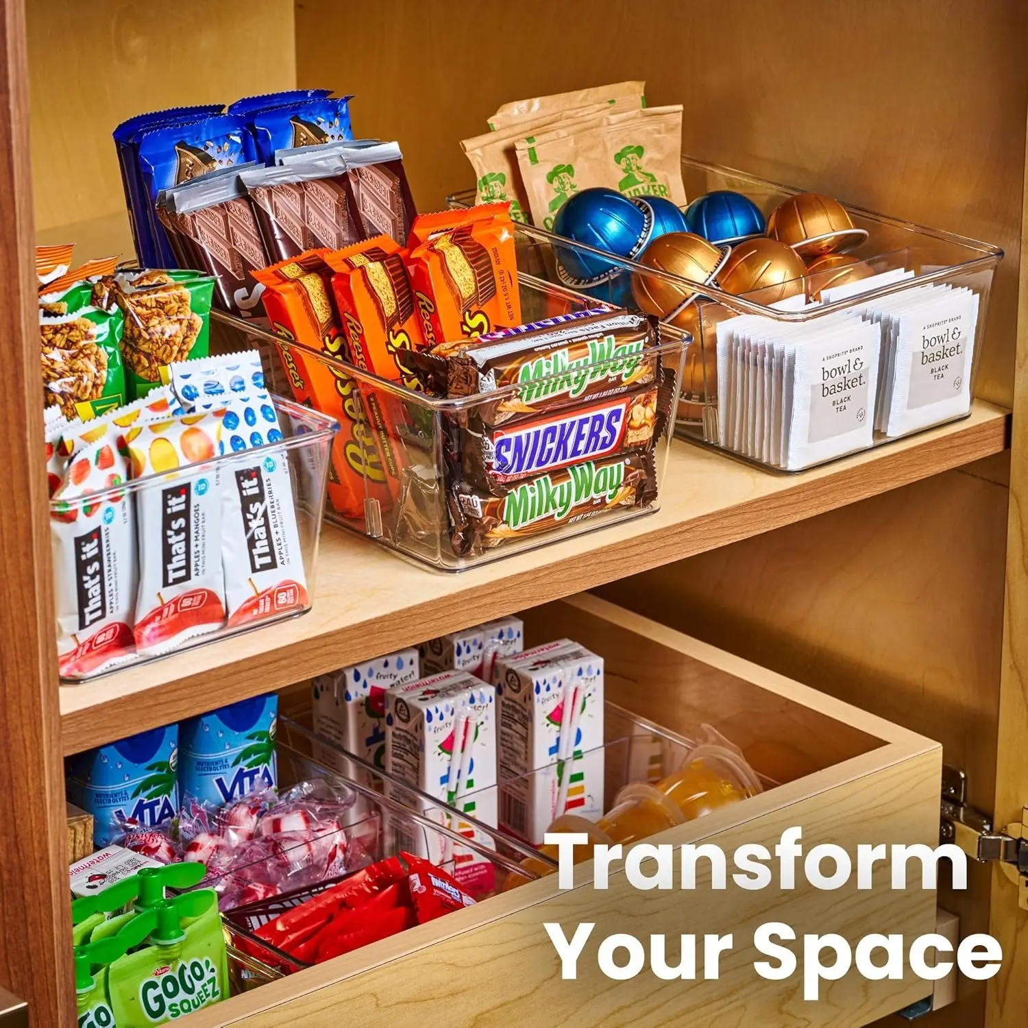 3 removable dividers per bin, you can perfectly tailor your storage to fit snacks, drinks, spices, tea bags, and so much more. Finally, an organized space where you can see everything at a glance! #PantryOrganization #FridgeOrganization #HomeHacks #TikTokMadeMeBuyIt